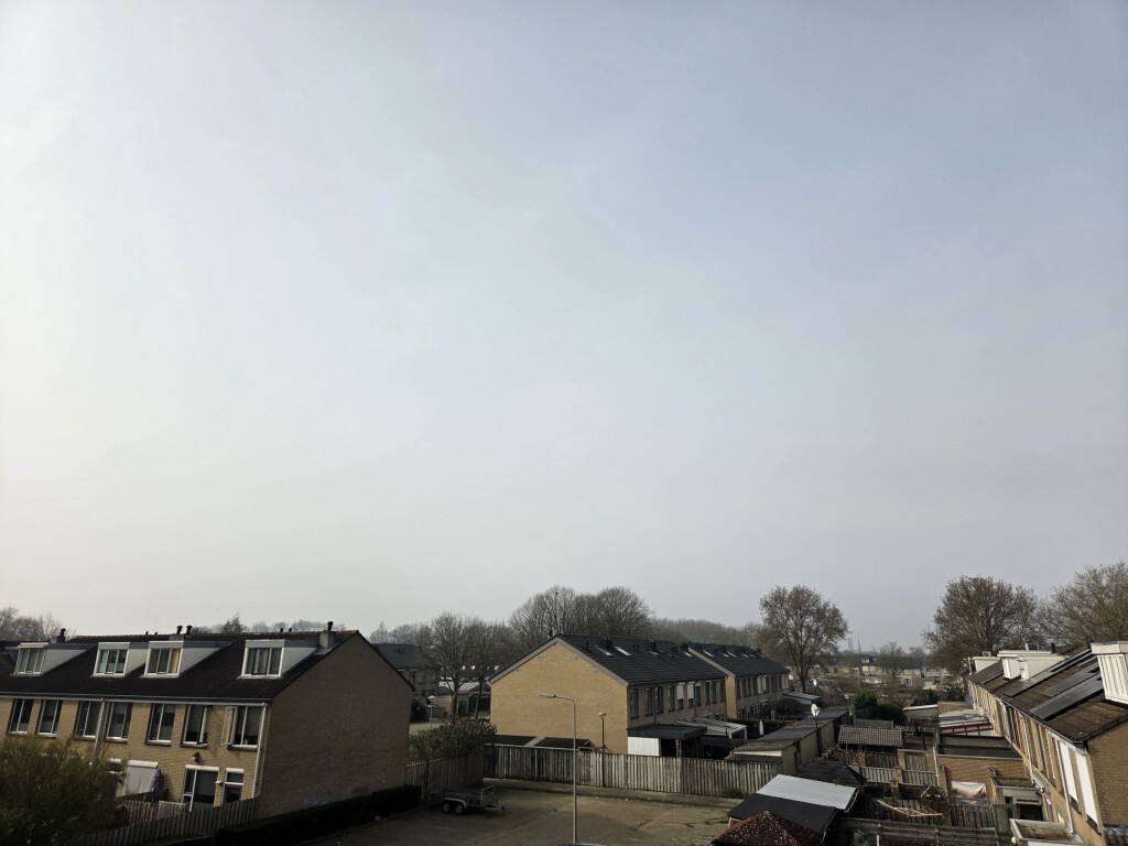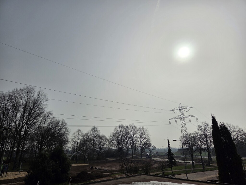 Door de dikke laag Saharastof is het licht zo flets dat het niet voelbaar warm is, wanneer je in de zonneschijn staat. Desondanks veel beter dan vlak ten westen van hier. Waar de meest gevaarlijke wolkensoort inmiddels de Maas bij Lith aan het oversteken is. Dit laatste getuige de meest recente satellietbeelden.