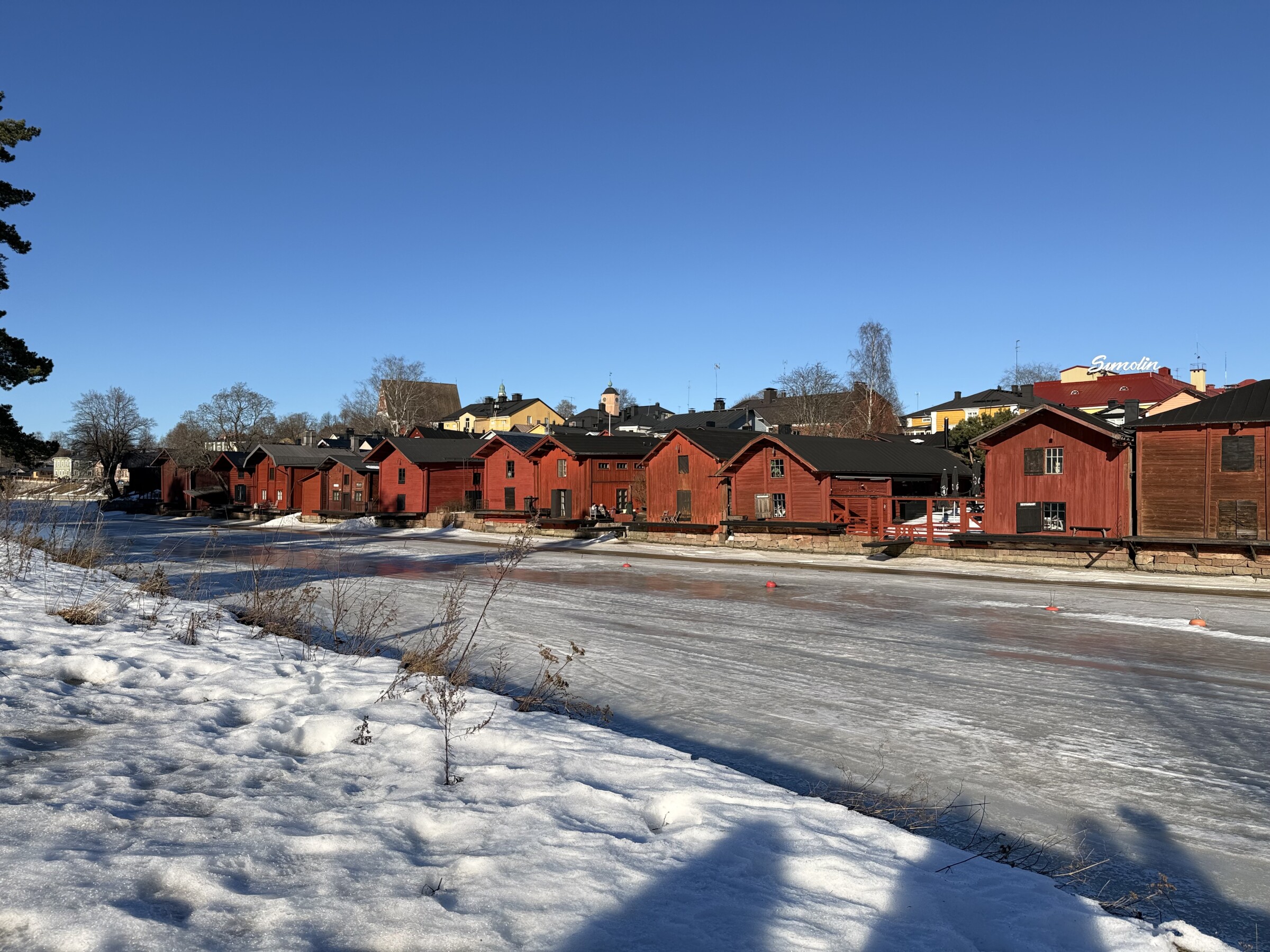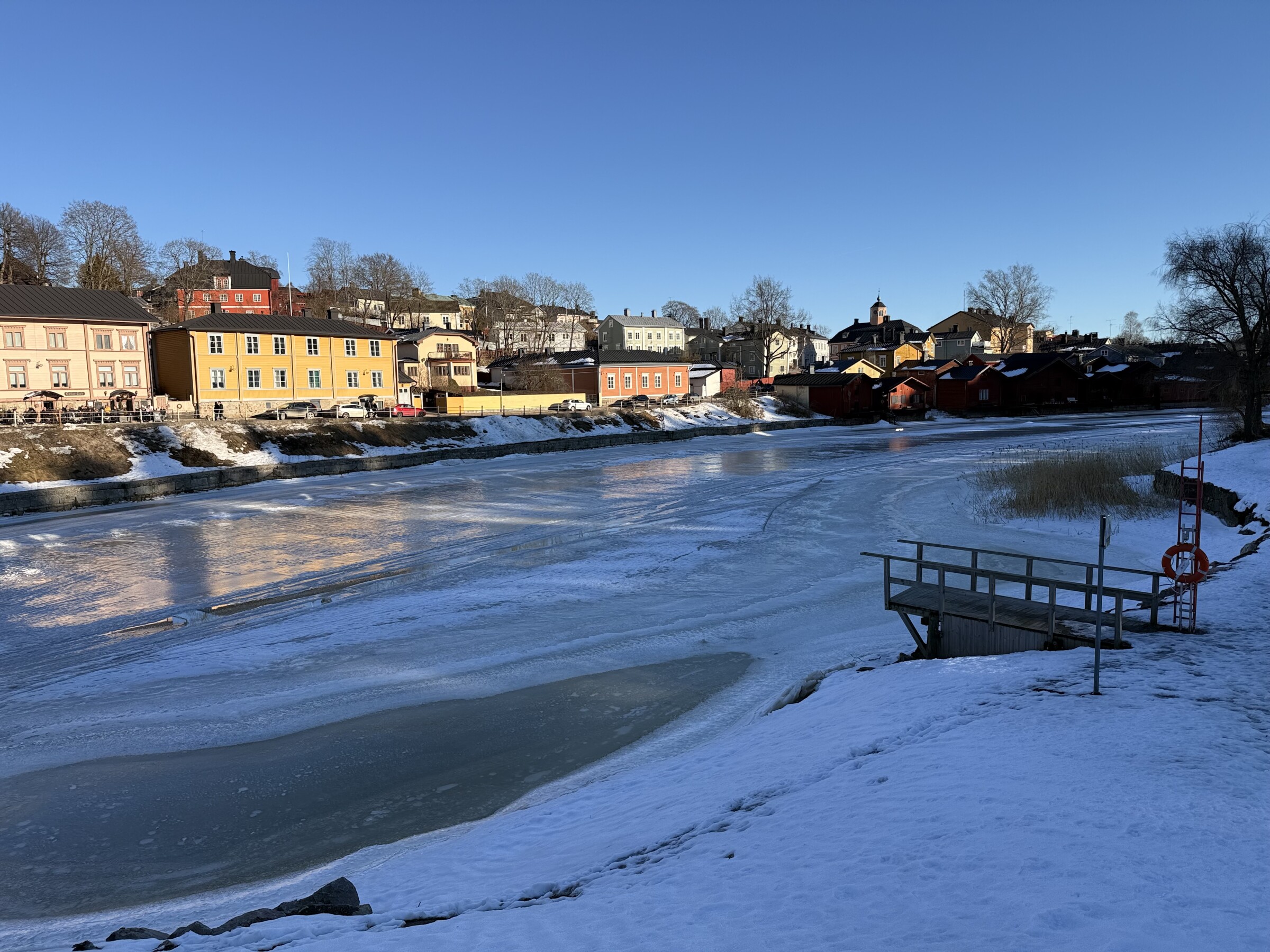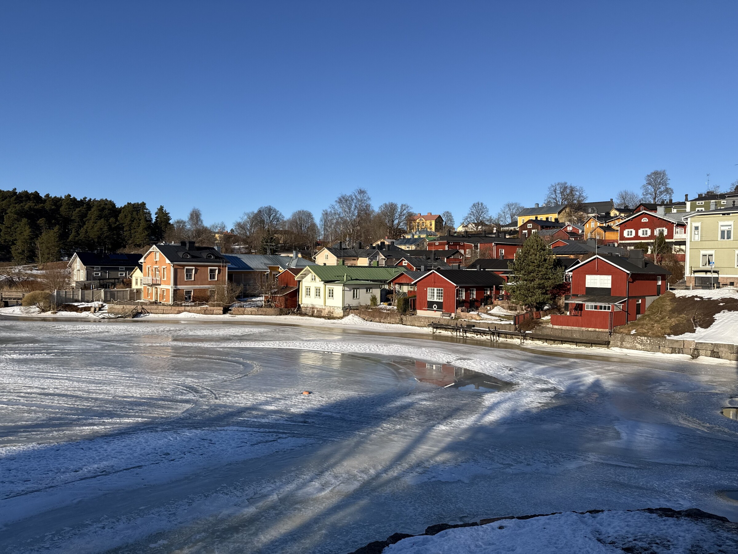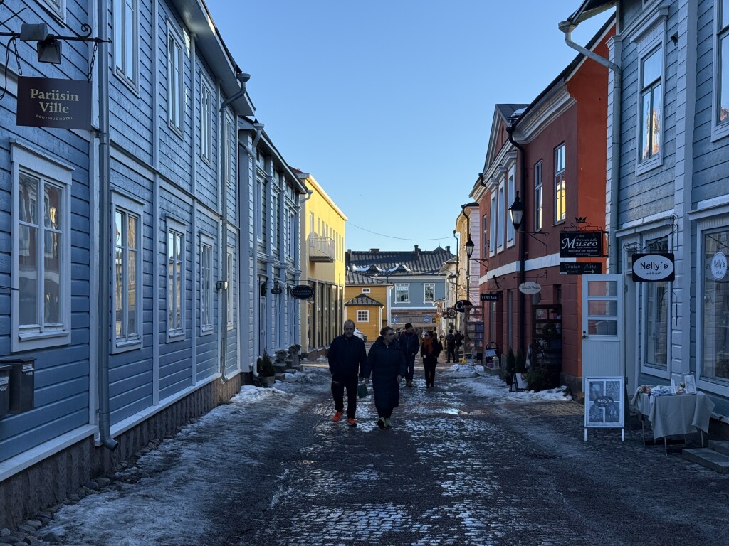 Het komt perfect uit voor de stedentripjes deze dagen: vandaag was Porvoo aan de beurt, een pittoresk stadje dat iets ten oosten van Helsinki ligt. Bij 8 graden was het gewoon perfect weer om zonder jas buiten te lopen! Wel is het soms nog behoorlijk glad (vooral op schaduwplekken) doordat smeltende sneeuw ‘s nachts weer bevriest…