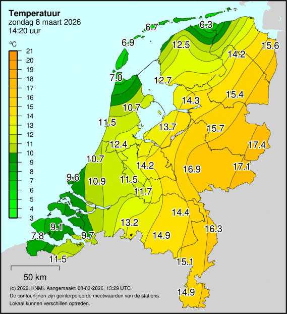 Op de Wadden 6.7C en in de Achterhoek 17,4C.