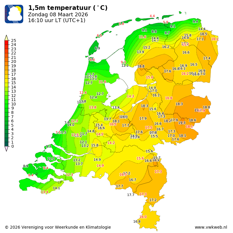 Wel prachtig weer. Tx 14,0 heel vroeg in de middag en sinds daarna daling. De kou ligt klaar bij Theo en bij het Lauwersmeer.