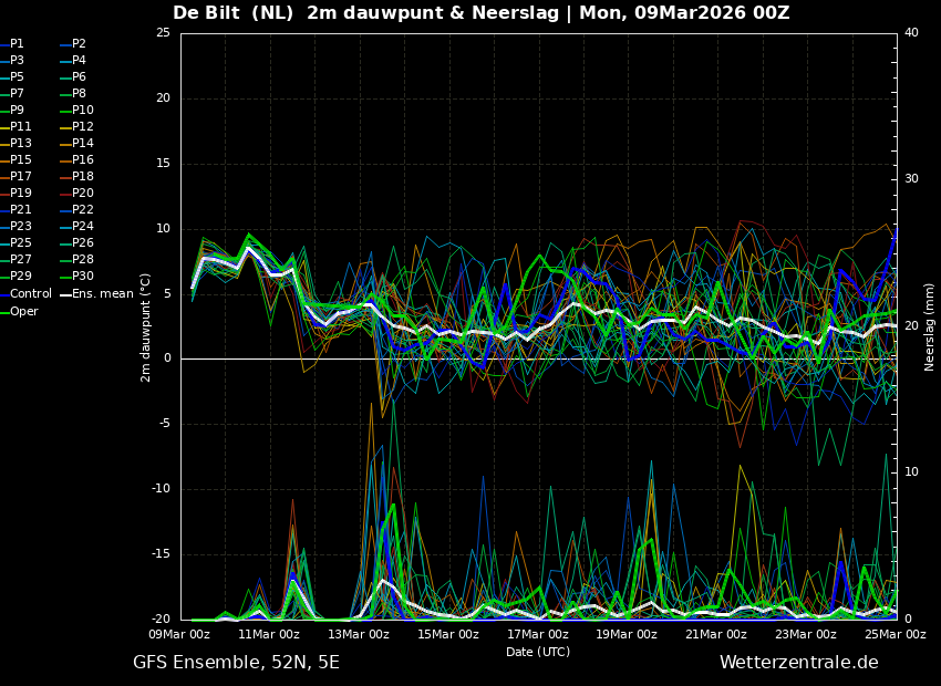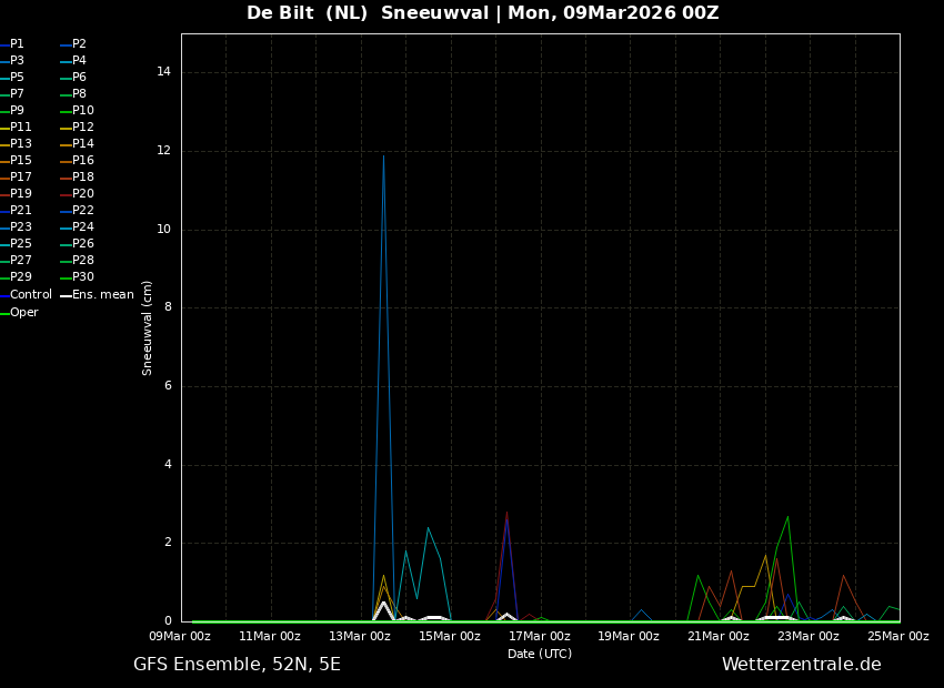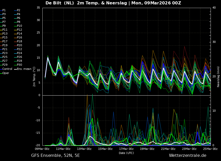 De Oper laat voor morgen een maximum temperatuur zien rond 11 graden en ligt daarmee onderin het ensemble.