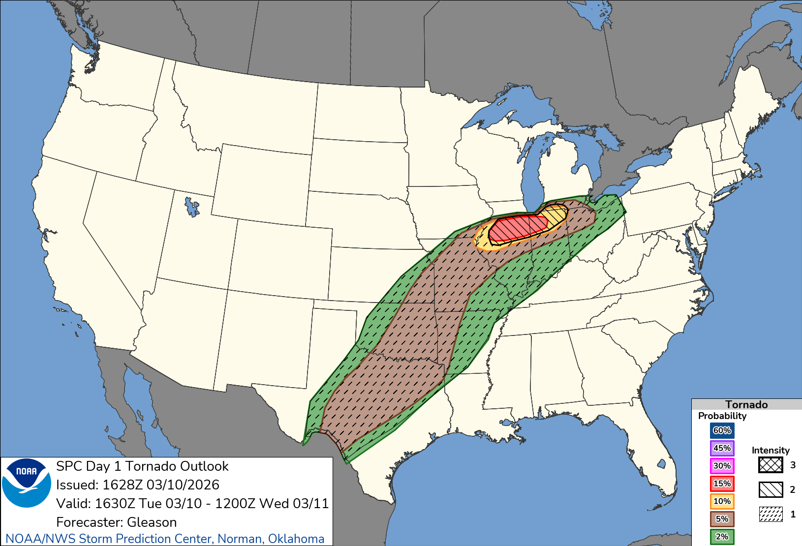 Sinds dit jaar werkt het SPC met 3 niveaus van intensiteit, naast de bestaande kansverwachtingen ('Probability') in de legenda. Het is de eerste keer dat het SPC een intensiteit van niveu 2 uitgeeft voor tornado's, aangegeven met het schuingestreepte gebied op de kaart.
