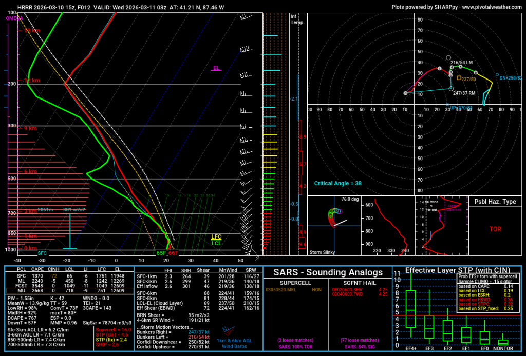 Het Storm Prediction Center heeft voor vanavond een Moderate (niveau 4/5) uitgegeven voor zwaar weer. Vooral in het gebied ten zuiden van Chicago worden zware supercells verwacht. Hierbij gaat het SPC vooralsnog uit van een kans van 15% op een tornado binnen 25 mijl (40 km) van een willekeurig punt binnen het Rode gebied. De gesimuleerde sounding en hodograaf ziet er dan ook vrij intens uit voor de tijd van het jaar en de locatie.