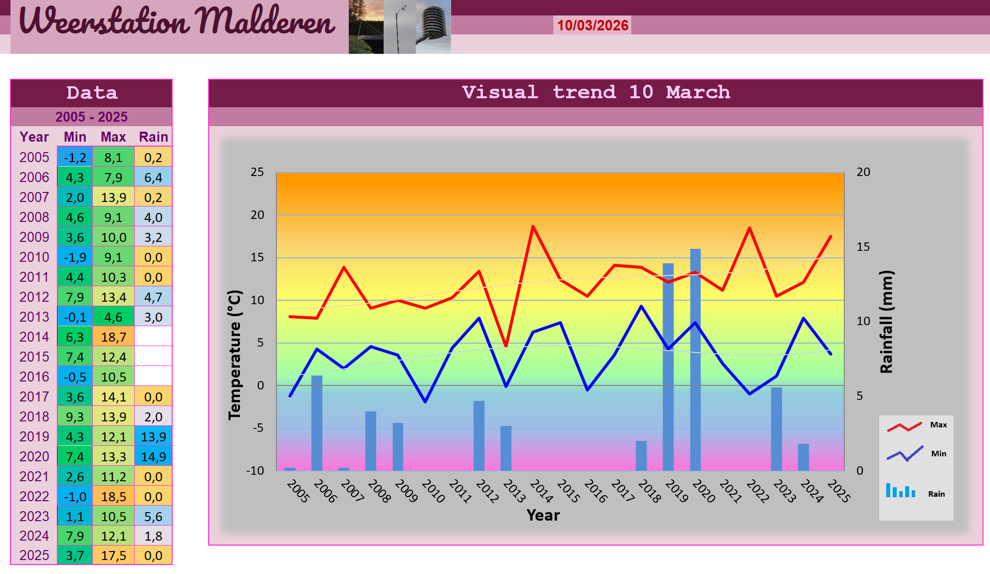 Na een rustige en bijna windstille nacht kregen we vanochtend met een aantal regenbuien te maken. De voormiddag verliep dan weer grijs en regenachtig bij een ietwat aangewakkerde zuidwestenwind. Het was wachten tot kort voor de middag toen het opklaarde, met een vriendelijke zomerlucht vol mooiweerswolkjes. Maar het zag er allemaal bedrieglijk onschuldig uit en het was pas toen we door die mooiweerslucht dakpannen, golfplaten, bomen en carports zagen vliegen dat het duidelijk werd dat we middenin een zeer zware voorjaarsstorm waren terechtgekomen. Wie zich buiten waagde kon zich aan nog meer rondvliegend puin verwachten aan de luide knallen van metaalplaten die de omgeving lieten opschrikken. Het puin werd aanvankelijk vanuit het zuidwesten onze richting uit geslingerd maar later kwam er meer een westcomponent in waarbij opeens veel koelere lucht binnenstroomde. De windruiming kwam net op tijd om een losgesprongen telefoonkabel net naast het weerstation te laten belanden en daarna werd het opeens een stuk rustiger. De maxima waren net bereikt met 12,1 graden en de afkoeling ging gepaard met een aantal forse buienlijnen die voor stortregen en wat hagel zorgden. Het kwik dook meteen naar de uiteindelijke minima van 4,3 graden en plaatselijk werd zowaar smeltende sneeuw waargenomen. Tijdens de avond volgden er meer buien die geleidelijk aan ook in Malderen een winters karakter kregen. Het neerslagtotaal kwam uit op 13,9 mm al ligt het in werkelijkheid wat lager daar de pluviometer tijdens de storm in de vijver is beland.