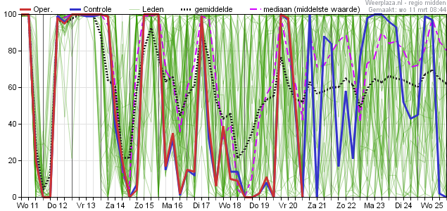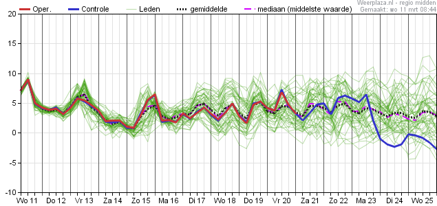 Na woensdag zakt de temperatuur weer iets, met eerst waarden rond 13 of 14 graden en de laatste dagen van de periode rond 11 of 12 graden.