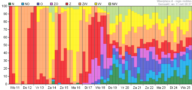 De windrichting zit voorlopig tussen zuid en west, maar gaat begin volgende week even richting zuidoost, alvorens naar noordwest te draaien.