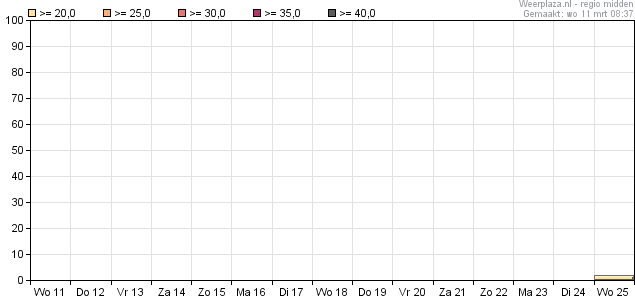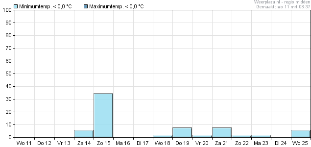 De vorstkansen zijn iets talrijker in aantal, maar tegelijkertijd niet erg kansrijk met de grootste kans (zo'n 34%) in de nacht van zaterdag op zondag.