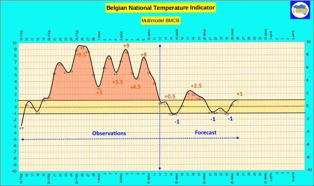 Voor de periode van 15 tot 26 maart zou deze thermische index tussen –1 en +2 blijven schommelen. De dagtemperaturen zouden op de koelste dagen tussen 7 en 14°C liggen, met nog steeds kans op lichte plaatselijke nachtvorst, vooral in het binnenland en ten zuiden van de Samber- en Maasvallei.