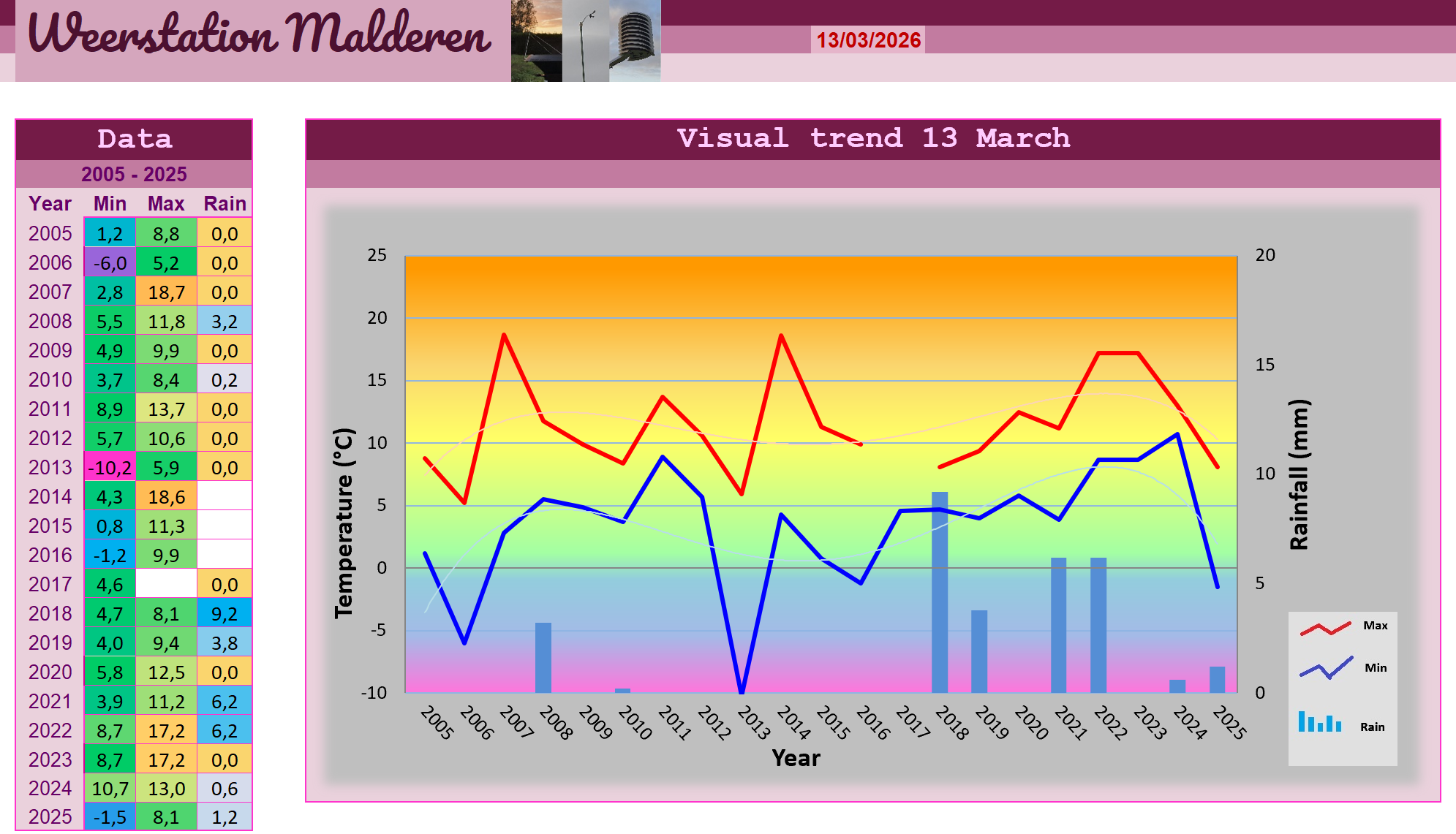 Na minima van 5,8 graden te hebben opgetekend, bleven we vandaag in de onstabiele polaire lucht zitten. De bewolking bestond uit Stratocumulusvelden waartussen Cumulus ontstond die er soms dreigend uitzag en plaatselijk weer voor pittige buien zorgde. Op sommige plekken werd ook hagel waargenomen. Maar de buien werden minder intens en alles leek zeker na de middag weer tot rust te komen. In Malderen is die rust overigens niet weggeweest want de pluviometer bleef op 0,0 mm staan en de buien trokken ten zuiden ervan langs. De lente kwam weer vanachter het hoekje kijken met redelijk wat zon en het kwik kreeg een opwippertje naar 12,5 graden. Toch moesten we op onze hoede blijven want tussen de bedrieglijk onschuldige Stratocumulusveldjes die er bij de avondschemering hingen zaten nog verradelijke buitjes ingebed, en deze waren alleen maar te herkennen aan de valstrepen die eronder hingen en door veel mensen niet (tijdig) zouden worden opgemerkt. Op de radar was ook te zien dat er in Nederland nog een aantal zwaardere buienlijnen aanwezig waren. Deze bleven echter ten noorden van Malderen waardoor we het voor de rest van de avond ook vrij rustig hielden met breder wordende opklaringen en een vrij stevige afkoeling.