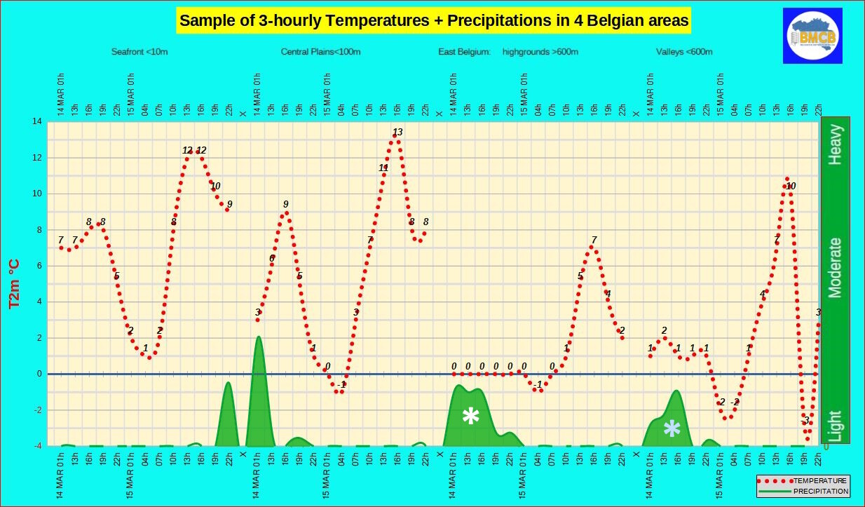 Zeer bewolkt tot betrokken met regen in de meeste streken. Overwegend droog in West-Vlaanderen en het westen van Henegouwen.