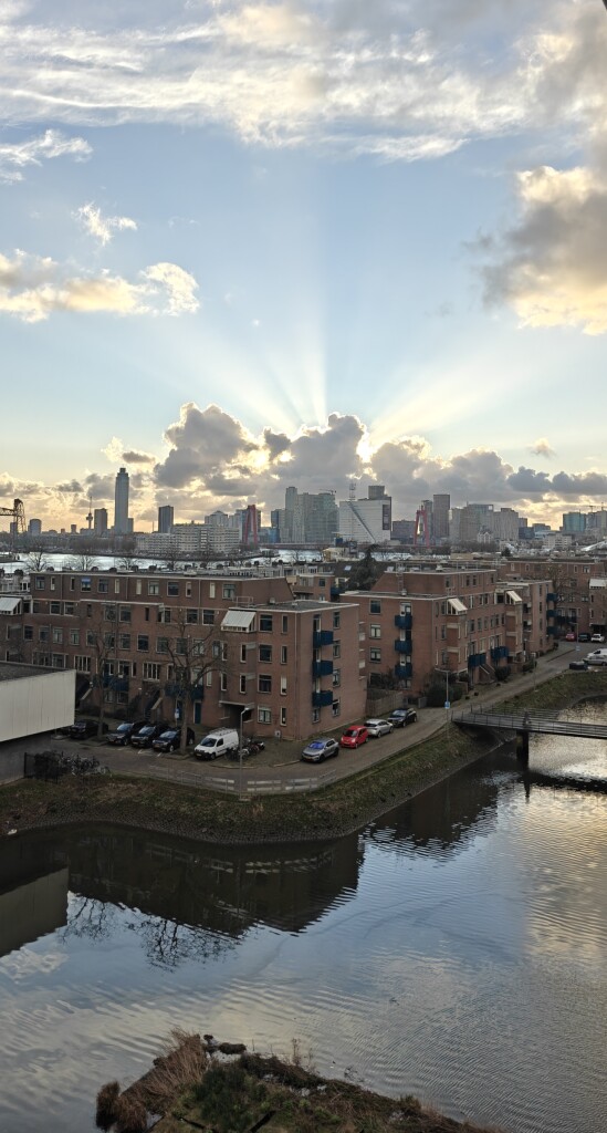 Een zonsondergang kan soms zo mooi zijn...Jacobsladders boven de skyline van Rotterdam