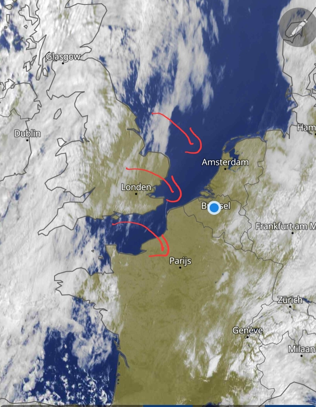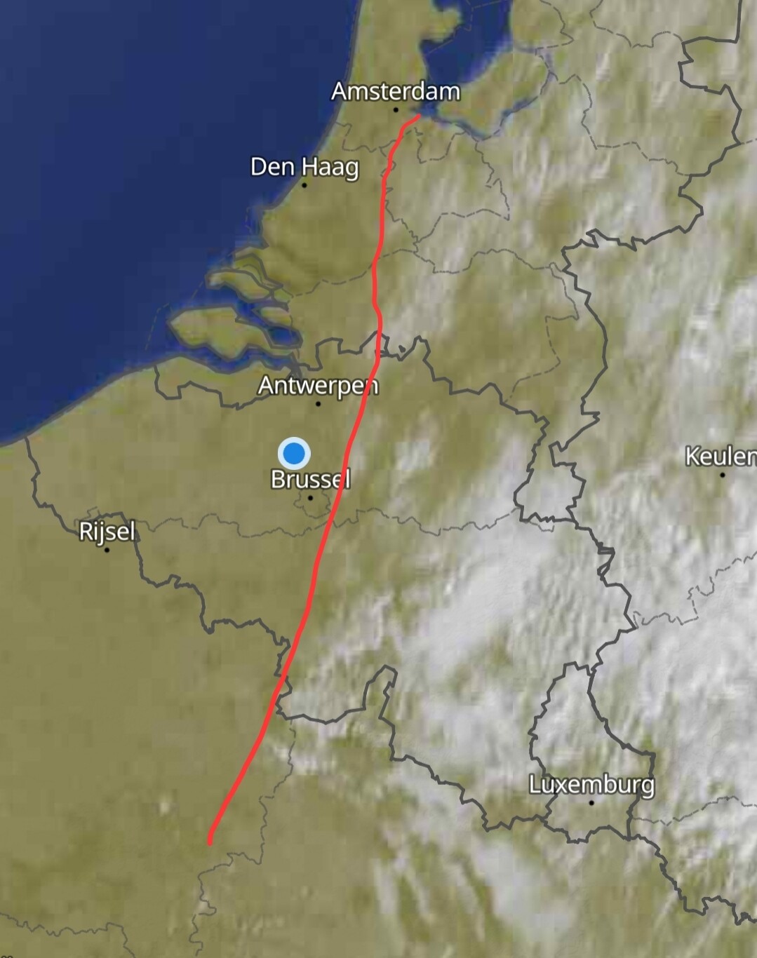 Je ziet hier dat de wolken ten oosten van de rode lijn ontstaan. Vermoedelijk is er warmte advectie aan de gang uit de storing die uit het Westen nadert. Die zou de bewolking vanuit het Westen weer moeten opruimen.