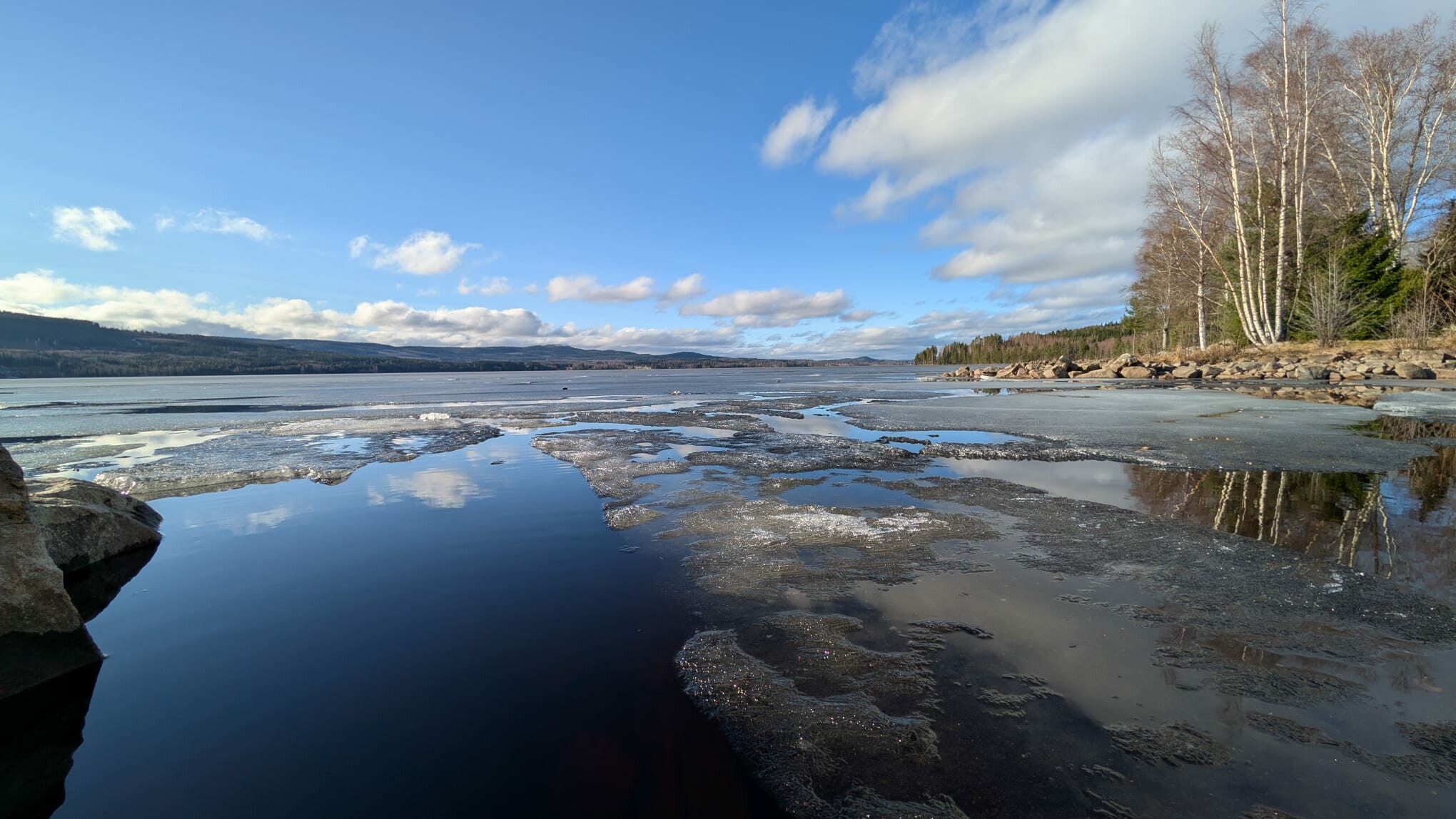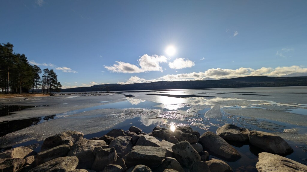 Het ijs op het meer smelt nu rap door de wind die meer grip krijgt op het water en het gebrek aan vorst. Foto van zondag (ijsschotsen waren nog 5-10 cm) vs vanochtend: