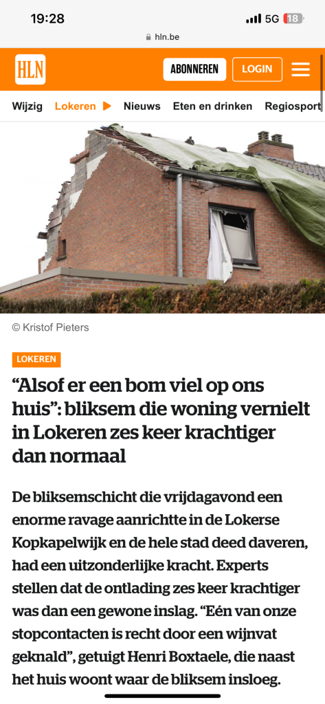 hier in België. In mei 2021 werd in Lokeren een hele woonwijk op stelten gezet door een inslag van 314kA. De inslag blies de bovenverdieping van een huis inclusief de ramen eruit. De tuin vatte vuur en de omwonenden hadden binnen overal schade aan hun elektrische aparatuur. Imposant. En de eerste keer dat ik ooit de impact zag van zulke krachtige ontladingen.