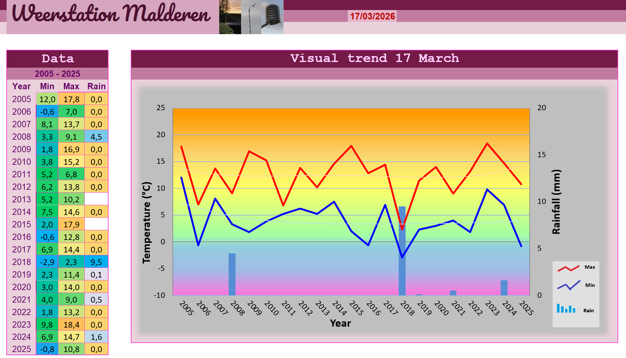 Omstreeks 5H in de ochtend passeerde uiteindelijk het koufront en viel er wat lichte regen wat goed bleek te zijn voor 0,1 mm. De plotse stijging van de luchtdruk markeerde mooi de overgang naar de polaire luchtsoort en tijdens de ochtend zagen we de Cirrus en Cirrostratusbewolking in een scherp begrensde band wegtrekken naar het zuidoosten. Diepblauwe luchten maakten hun opwachting en al snel ontstonden daar stapelwolken in die uitgroeiden tot buien. Op verschillende plaatsen kwam het tot onweer, hagel, wolkbreuken en windvlagen. In Malderen was het echter niets van dit alles en bleef het gewoon droog terwijl we van mooie wolkenlandschappen en zonnige perioden konden genieten. De krachtige wind en de snel dalende temperaturen lieten het ook hier echter guur aanvoelen. Tijdens de late avond riep binnendrijvende aambeeldbewolking de afkoeling een halt toe en zo strandden we op minima van 2,3 graden. Door de krachtige zon konden we de maxima vandaag nog achter het koufront optekenen met 11,4 graden.