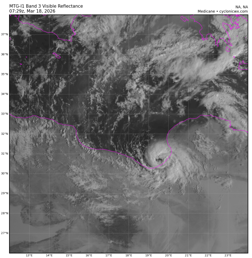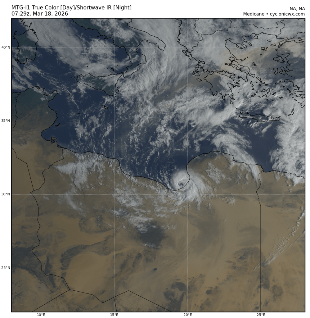 Het is een indrukwekkend systeem inderdaad. Er is in ieder geval een duidelijk oog zichtbaar binnen medicane Jolina, deze zal binnen redelijk korte tijd aan land komen in Libië.