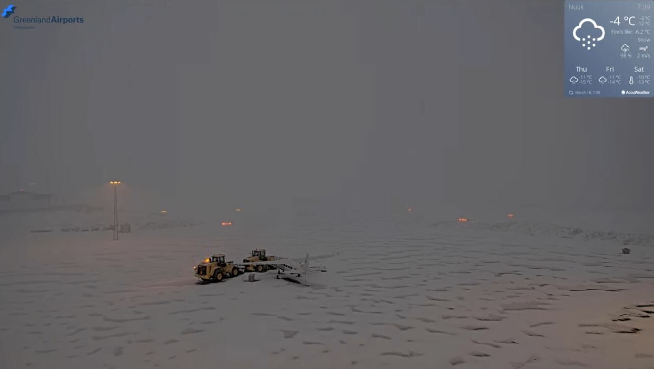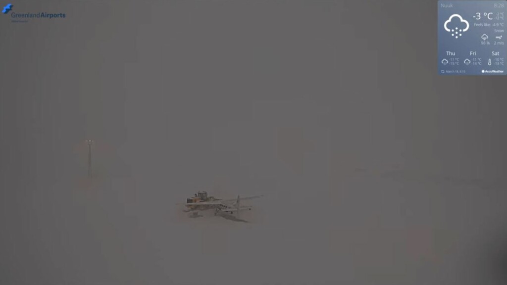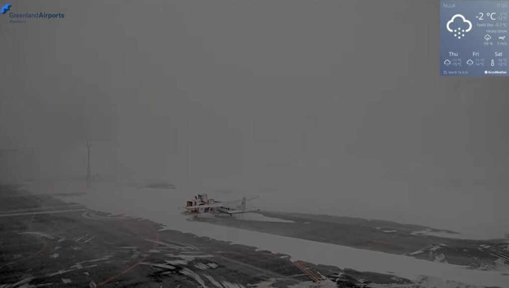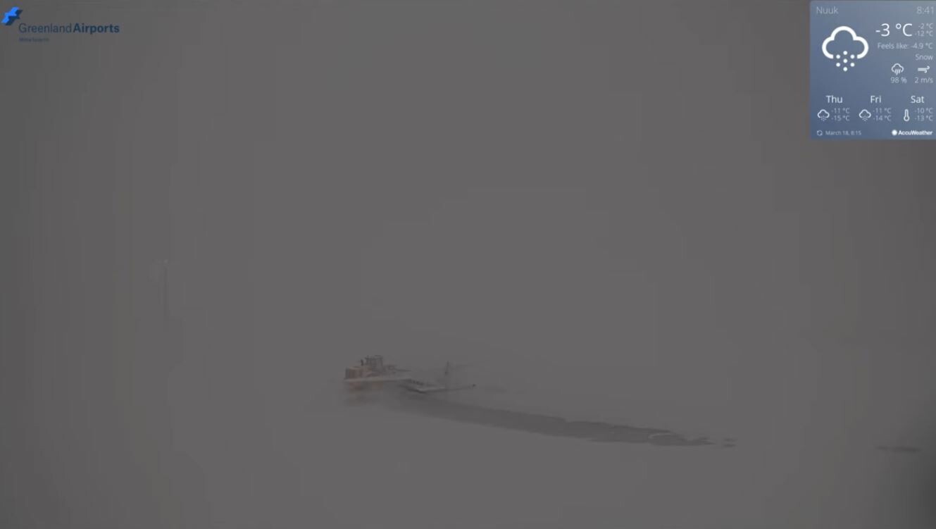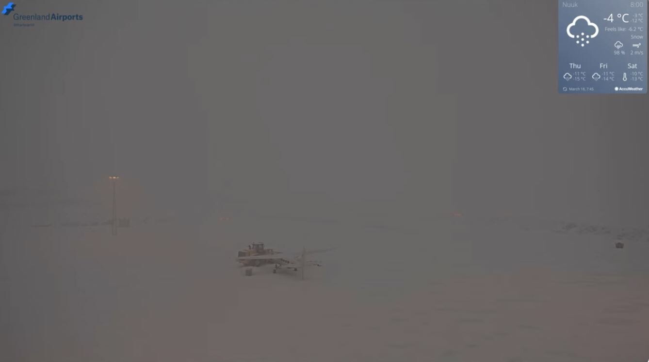 Zie de chronologische screenshots van het vliegveld (zuid). Tijdens de zwaarste sneeuwval is de wind even weggevallen, maar op de laatste foto geeft de windmeter 20 m/s aan en is te zien hoe er rond het vliegtuigje sneeuwduinen worden gevormd.