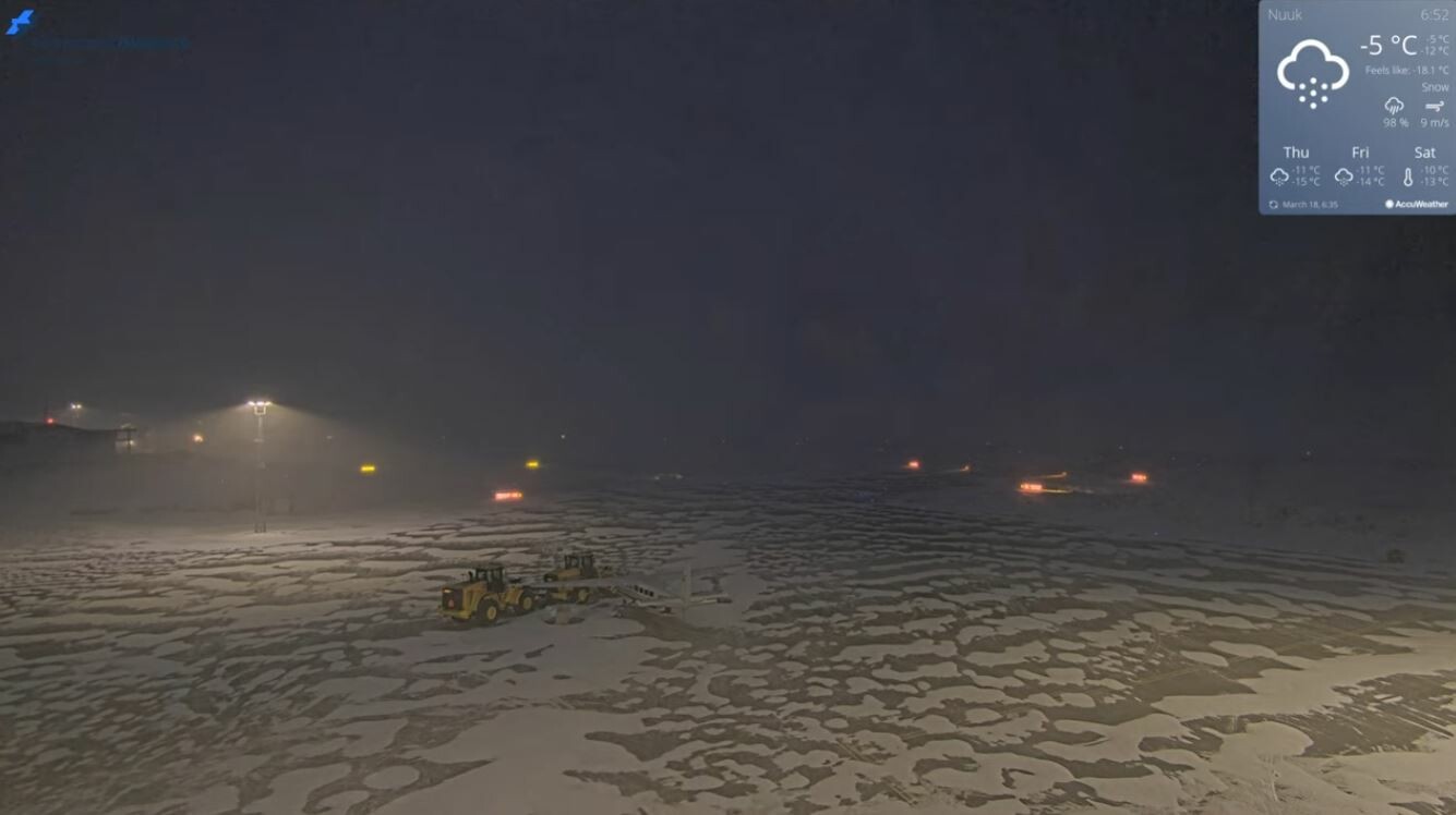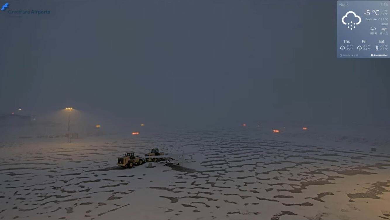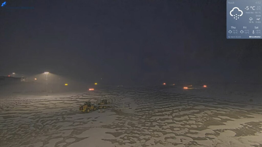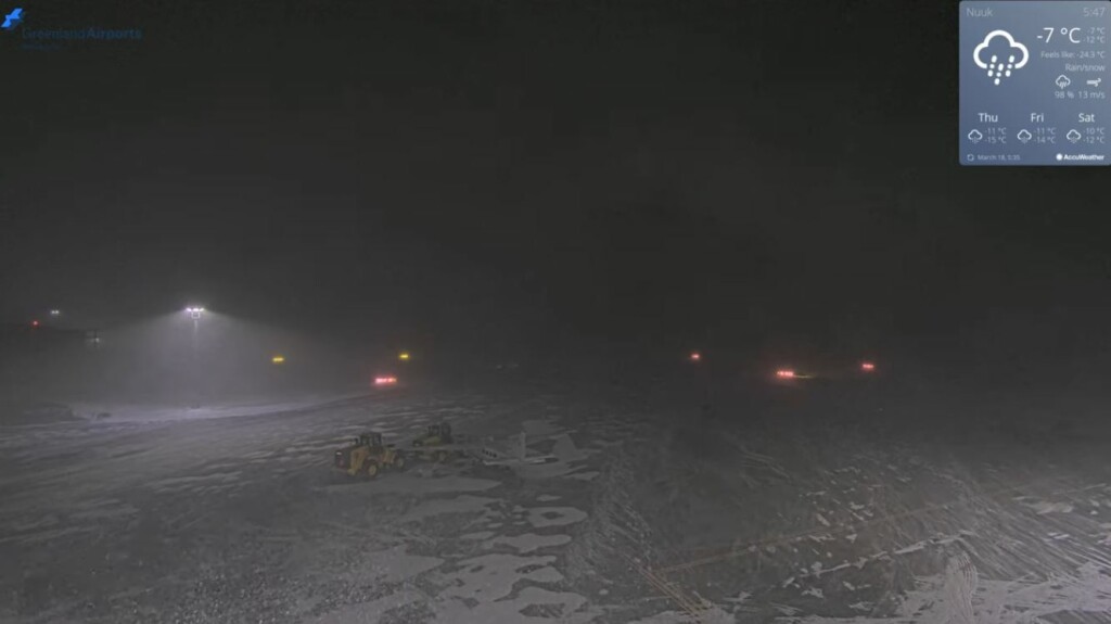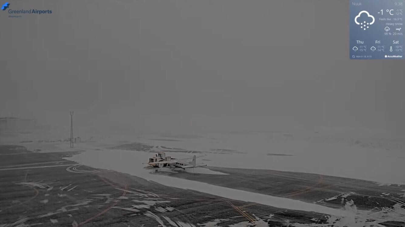Zie de chronologische screenshots van het vliegveld (zuid). Tijdens de zwaarste sneeuwval is de wind even weggevallen, maar op de laatste foto geeft de windmeter 20 m/s aan en is te zien hoe er rond het vliegtuigje sneeuwduinen worden gevormd.
