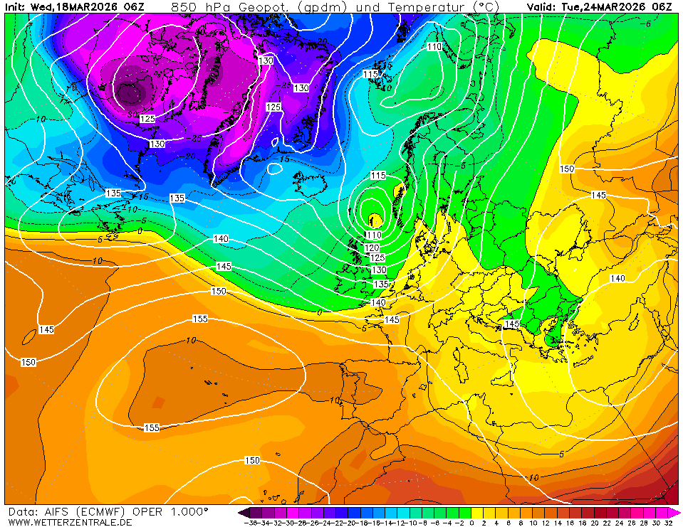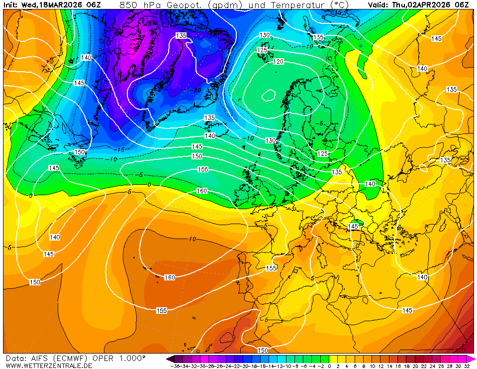 Inmiddels geen (gure) noordstroming meer, als het Azorenhoog al een poging onderneemt om een uitloper richting IJsland te sturen dan wordt dit direct platgewalst door depressiekernen die over/net ten noorden van Schotland richting Noorwegen koersen. Als deze koerswijziging in de 06z runs erin blijft zitten, dan zullen we dus eerder met een zachte WZW aanvoer te maken hebben dan een frisse en soms gure noordstroming. Onderstaand de nieuwste berekening van AIFS en EC voor dinsdag, dit waren de modellen die gisteren (en EC00Z vandaag ook nog) een noordstroming het meest zagen zitten.