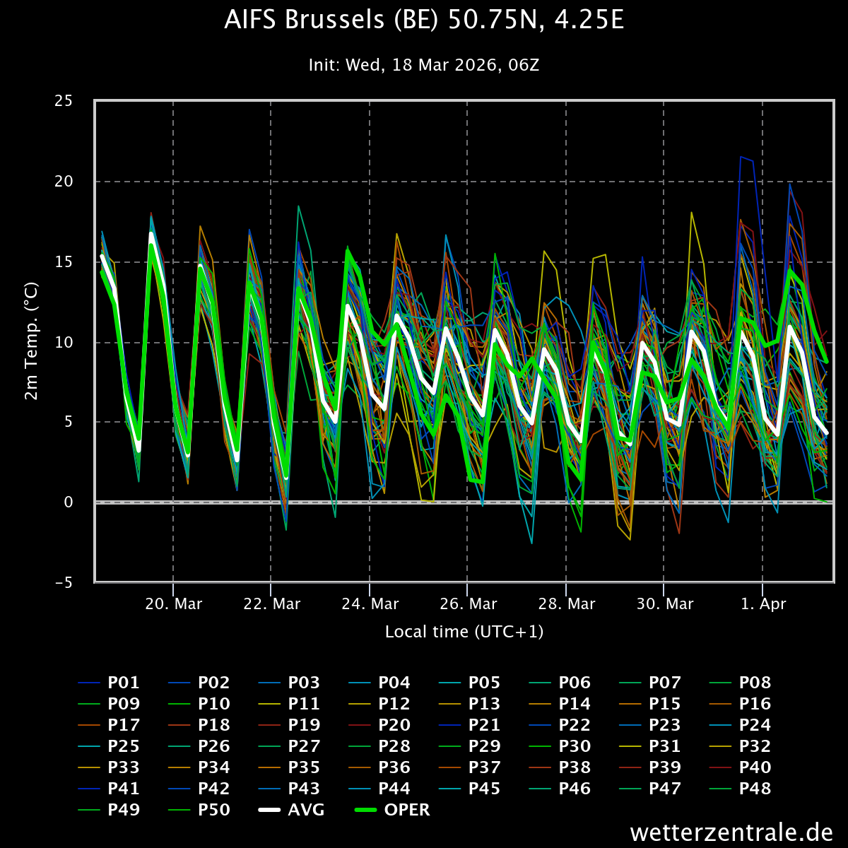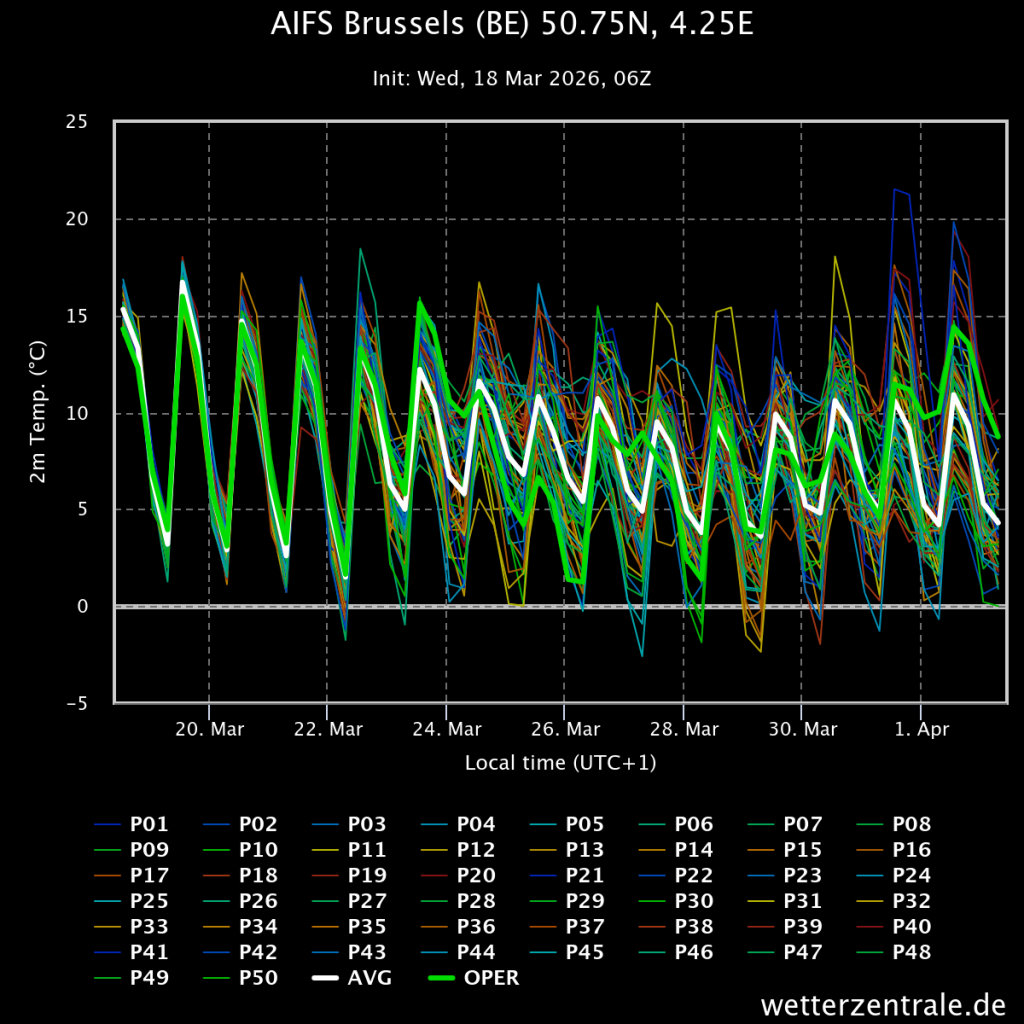 Met woensdag amper 7 graden volgens de oper en dagen nadien met moeite 10+ en af toe regen. Trend blijft voorlopig wisselvallig weer vanaf begin volgende week bij AIFS06, na een periode met mooi voorjaars-/lenteweer.