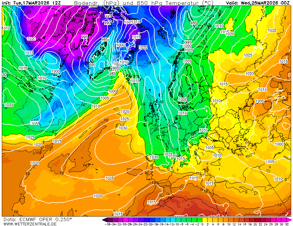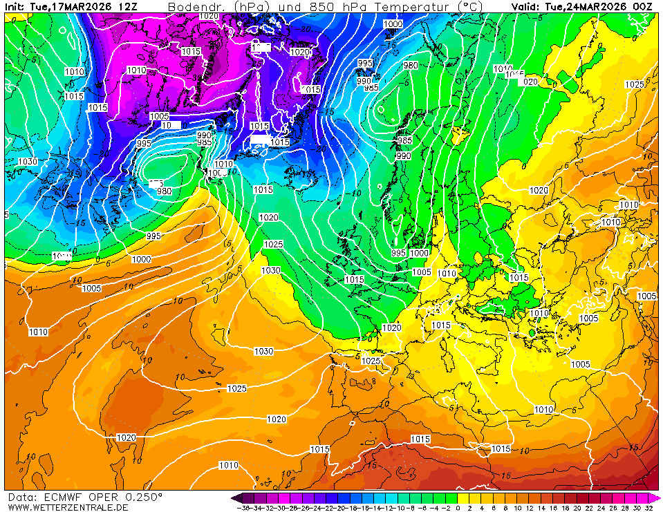 Zie hier de EC12Z van gisteren waar de post van gisteren o.a. over ging. Op dinsdag kruipt de -5°C over de Benelux heen en op woensdag -7°C op 850Hpa met een aanvoer vanuit het noorden. Daar is in de 06Z runs vandaag geen enkele sprake meer van.