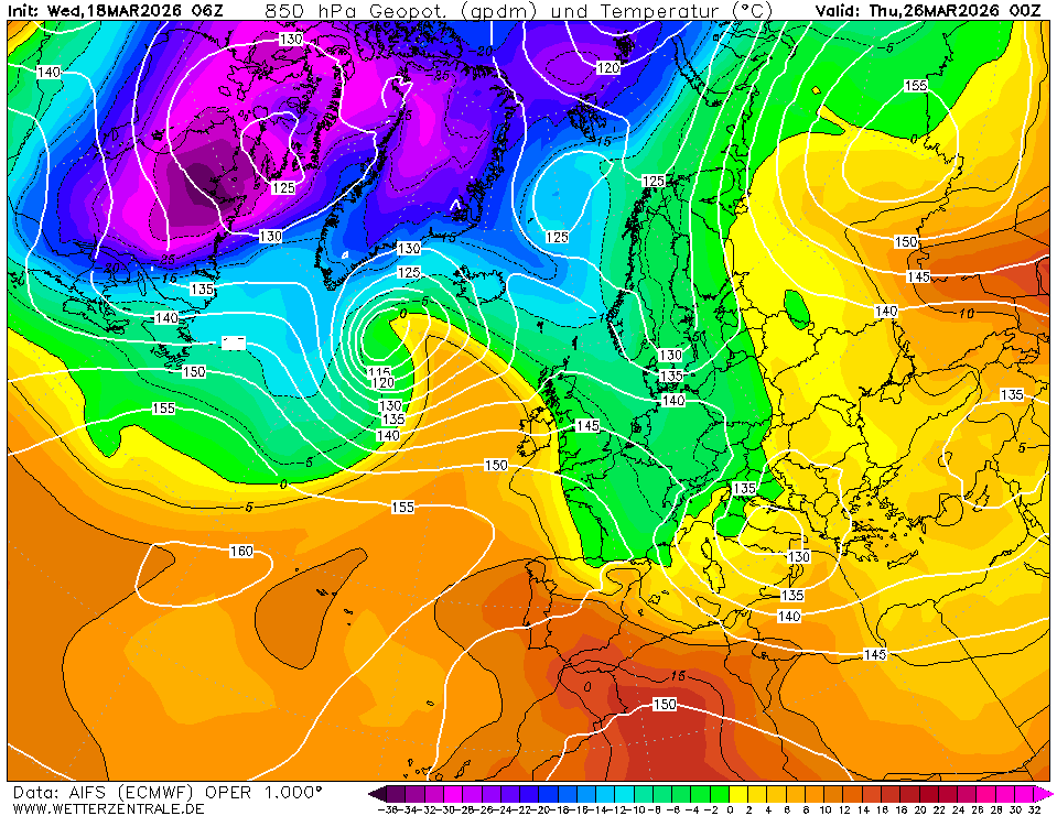 Hier de kaart van weer 24u verder en in die donderdagavond stromen de positieve temperaturen op 850Hpa weer over de Benelux. Maar goed, wat ik in elk geval duidelijk wilde maken is dat de evolutie in de modellen zo is dat een diepere noordelijke stroming er niet komt voorlopig