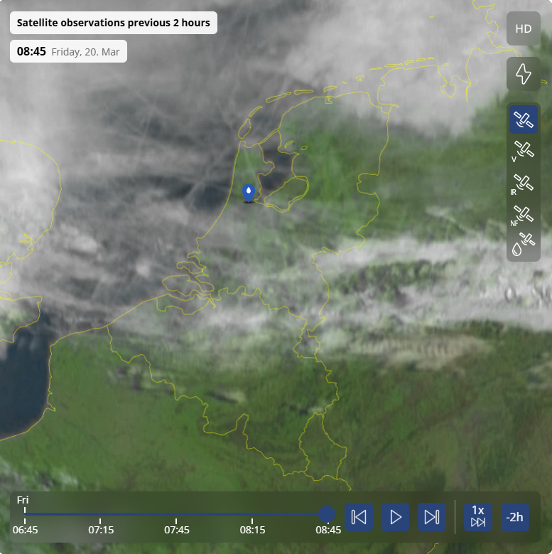 Op de sattelliet is de stratus goed te zien. Op het front boven zuid NL en BE vooral hoge bewolking.