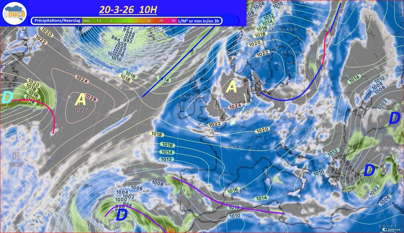 Een hogedrukgordel met waarden tussen 1022 en 1025 hPa strekt zich dit weekend uit van de Atlantische Oceaan tot Rusland, via de Britse eilanden en de Noordzee.