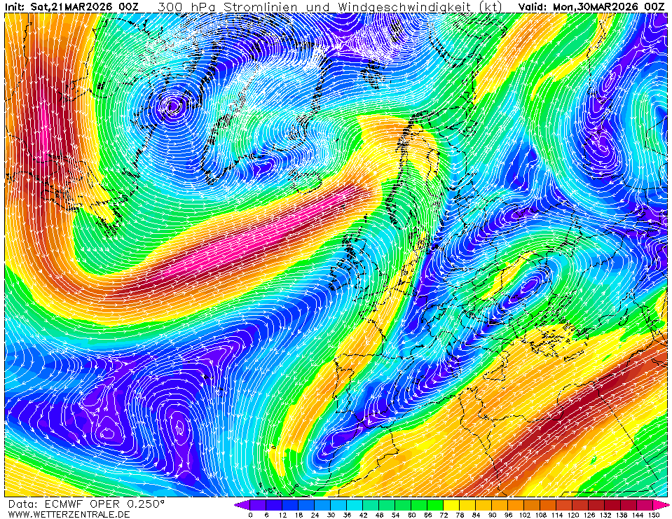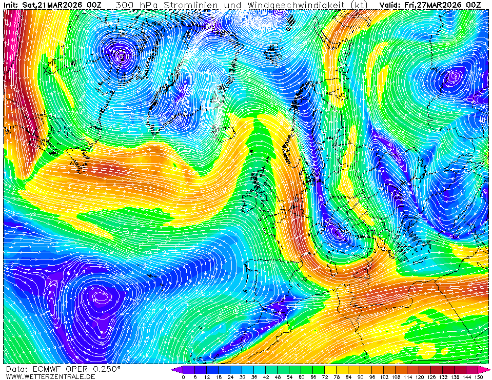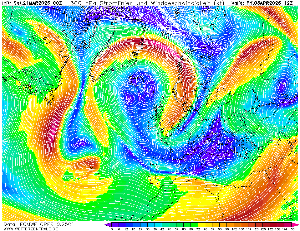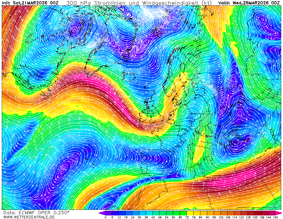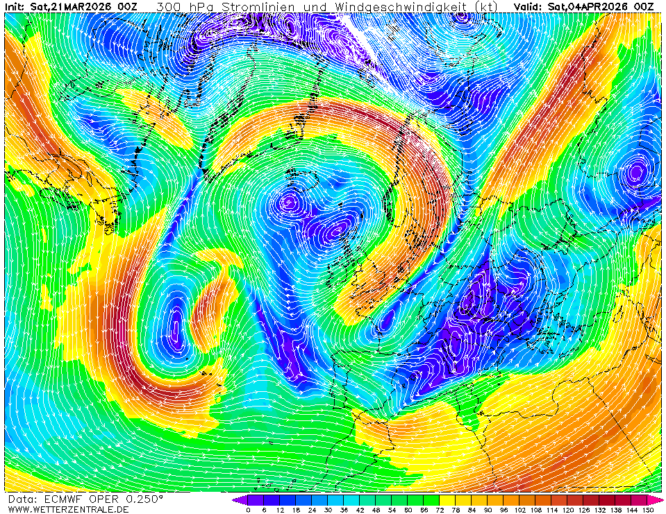Op de EC oper +96h kaart zie je beide duidelijk liggen. Boven Europa splitst de polaire straalstroom zicht in een aftakking naar Lapland en Noord-Afrika. Waar de laatstgenoemde samen met de depressie die al een tijdje bij de Canarische Eilanden ligt. De subtropische straalstroom aanjaagt boven de Sahara en verder naar het Midden-Oosten toe. Dat gebeurt verderop in de berekeningen op redelijk vergelijkbare manier nogmaals. Begin april ten noordwesten van ons een krachtige omegablokkade op de Atlantische Oceaan, als gevolg van deze aanhoudend sterke meandering, met zich afsnoerende luchtmassa's.