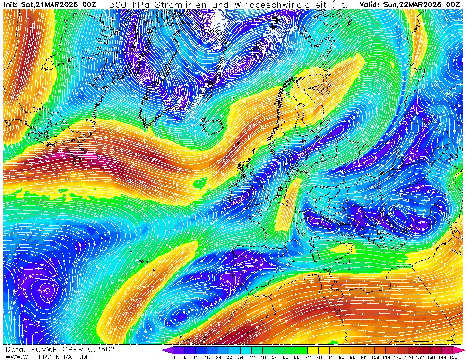 Maar die is normaal gesproken niet zo krachtig als de polaire straalstroom waar wij doorgaans mee te maken hebben rond 50-60 NB. Het zou kunnen dat de subtropische straalstroom nu tijdelijk zo sterk is door de uitbraak van koude lucht of evengoed dat de polaire straalstroom nu ongewoon zuidelijk is komen te liggen en de subtropische variant heeft weggedrukt/opgenomen in de stroming.