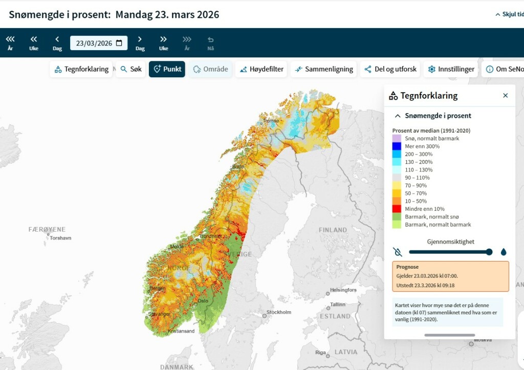 Voor vrijwel heel Noorwegen (ver) onder de norm. Het is weliswaar - van december tot februari dan toch - een koude winter geweest in Scandinavië, maar ook een hele droge.