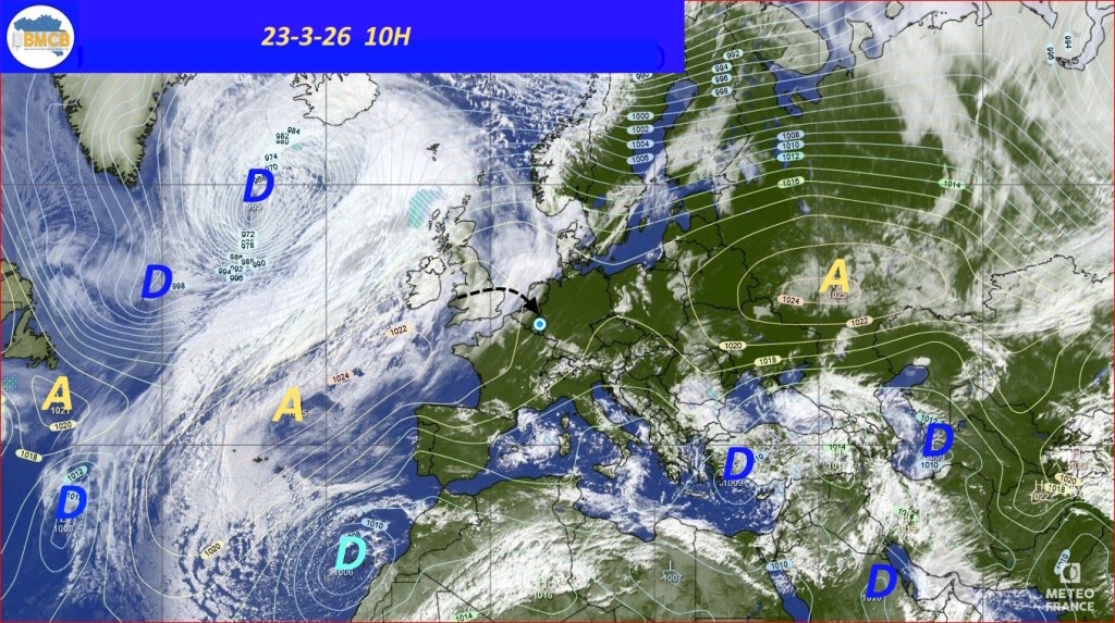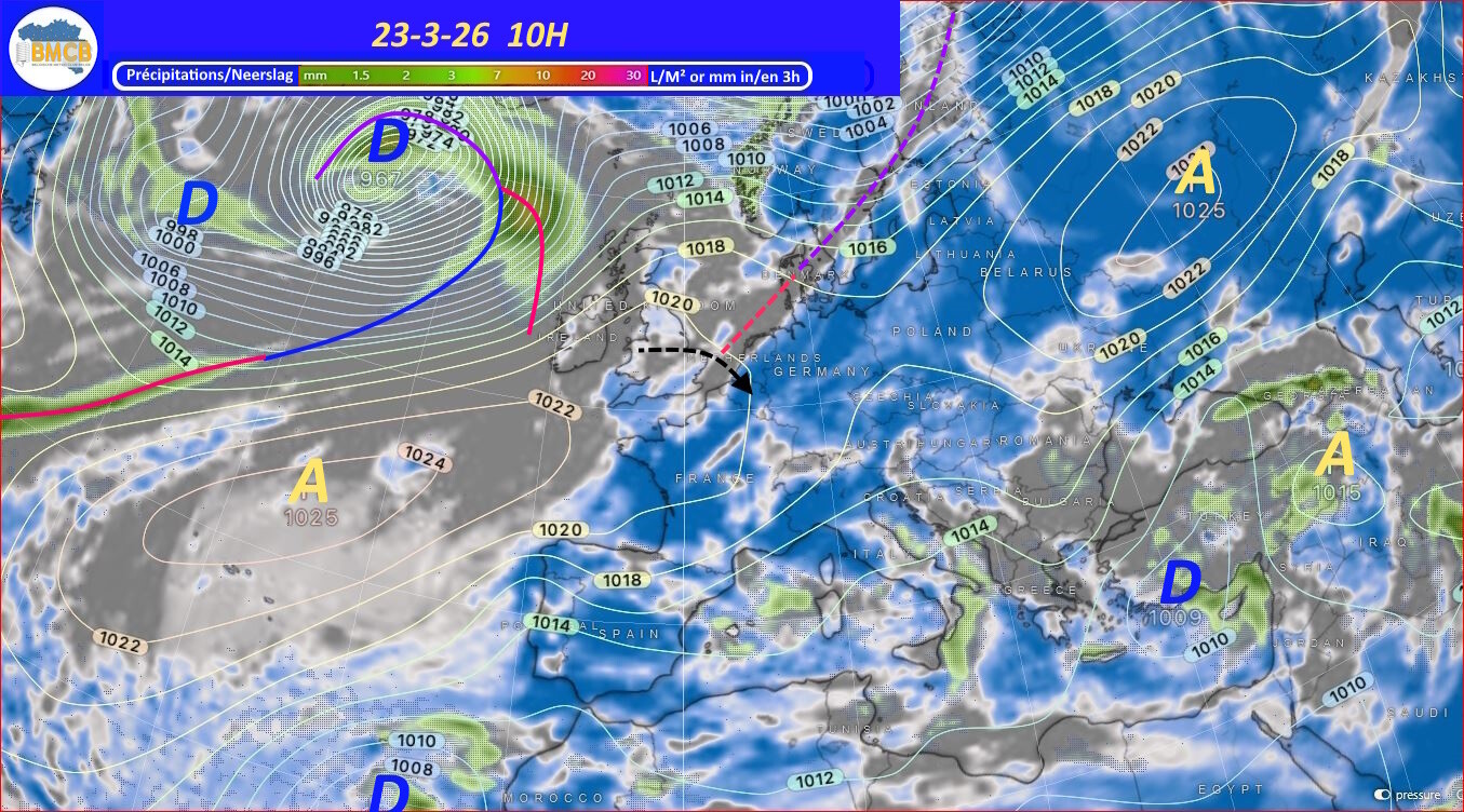 Vanaf de nacht van dinsdag op woensdag trekt een actieve storing over de Benelux met regen. Daarna volgt duidelijk koudere en onstabiele lucht, wat woensdag en donderdag aanleiding geeft tot talrijke buien langs de westflank van een depressie (±975 hPa) boven Scandinavië.