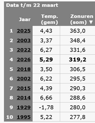 Periode 1 t/m 22 maart alleen in 2022 en 2025 nóg zonniger.