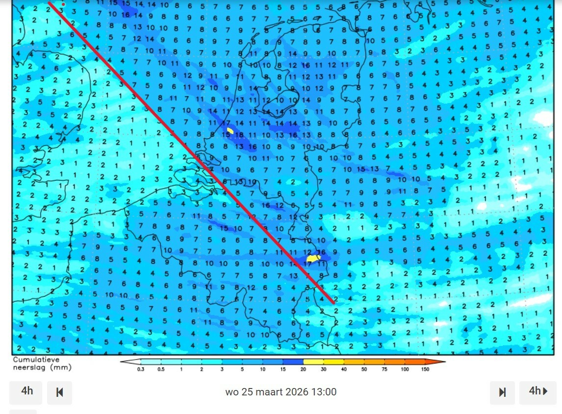 Dit zie je ook voorlopig in neerslagsom volgende 48 u... en ook buien die pas ontstaan na de westkust Belgie.