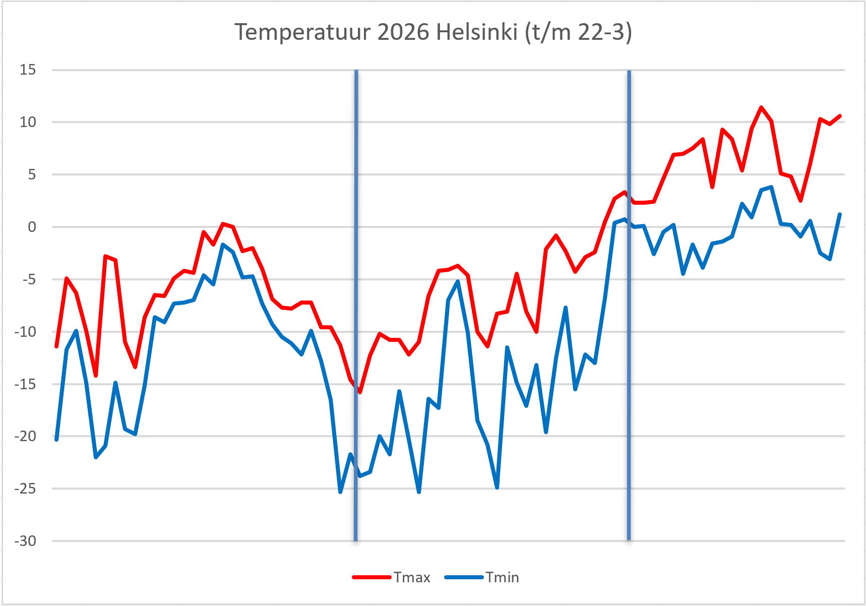 Hieronder een grafiek van de temperatuur dit jaar tot nu toe, met blauwe strepen heb ik de maandwisselingen aangegeven. Je ziet goed dat de dooi op 26/27 februari ingevallen is.