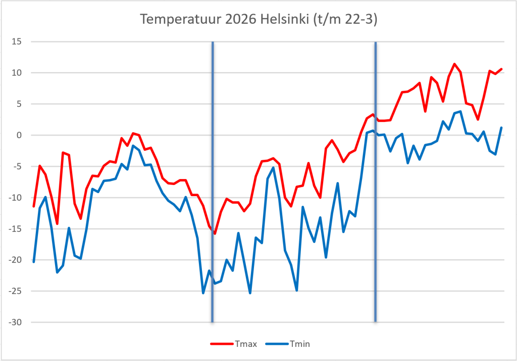 Na de steenkoude januari en februari in Noord-Europa, is het weer vanaf de maandwisseling drastisch omgeslagen. Hier in Helsinki is het in maart tot nu toe vaak zonnig en zacht, met overdag vaak 5-10 graden en ‘s nachts hooguit lichte vorst. Echt van totaalwinter naar lente in korte tijd.