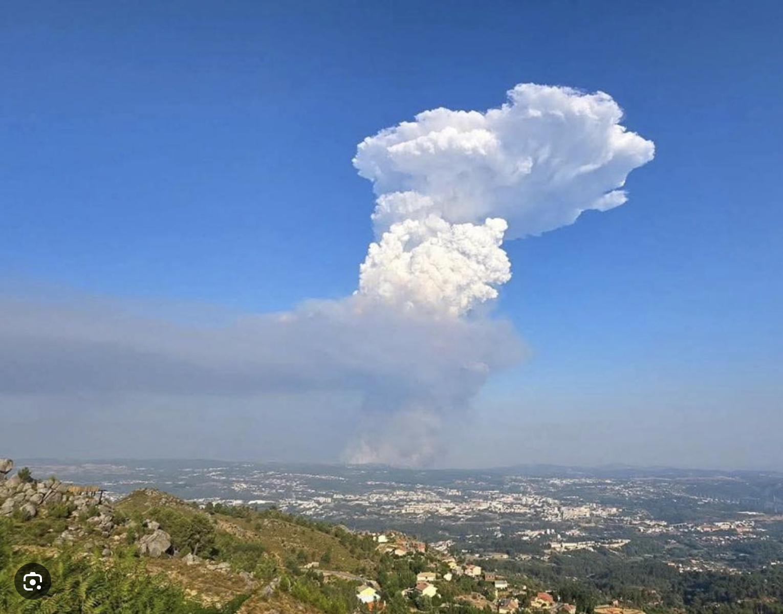 Deze mechanismen zijn hier zichtbaar op één beeld. In plaats van een stad (langdurig) gaat het om een bosbrand (abrupt) (Portugal, bron: buienradar.nl):