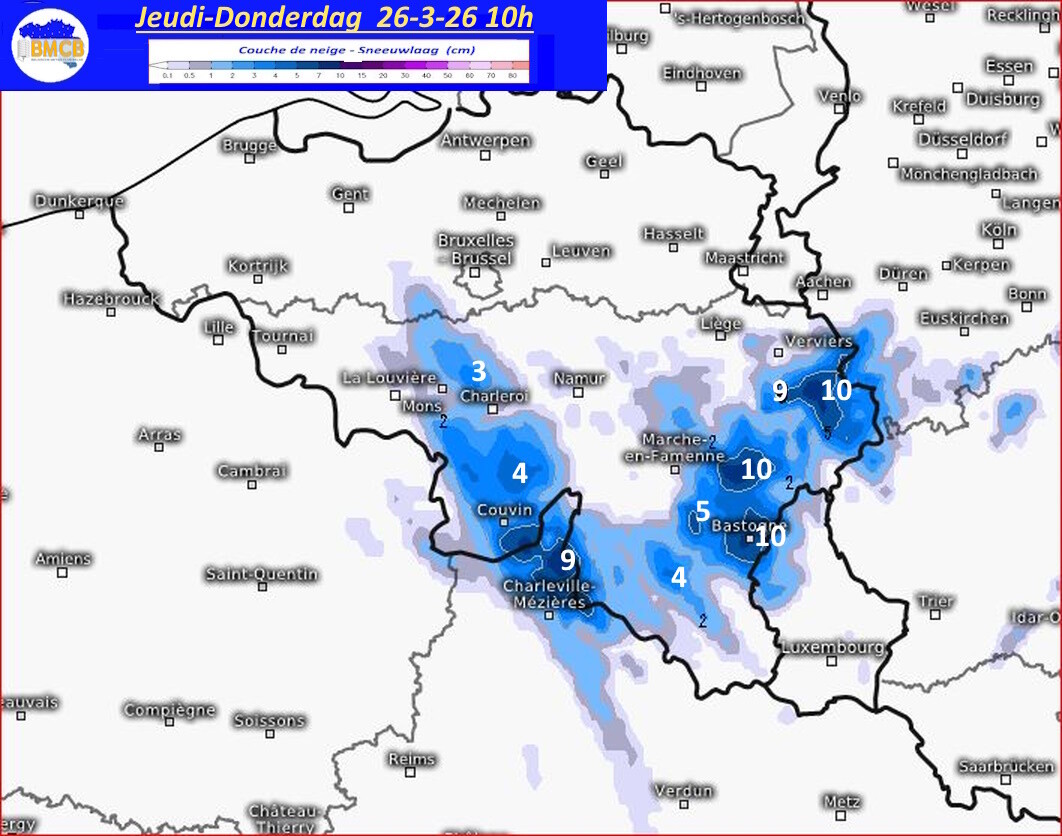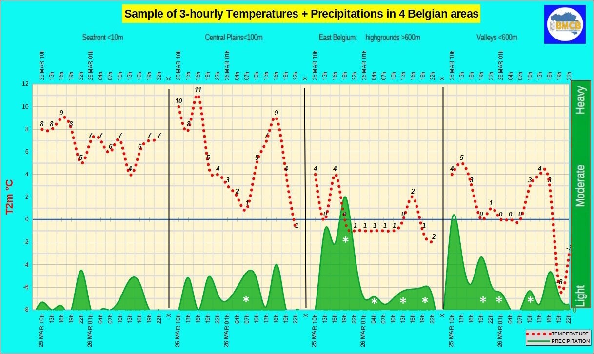 Vandaag wisselvallig met buien, soms met korrelhagel en lokaal onweer. Smeltende sneeuw vanaf 400 m, sneeuw boven 600 m. Maxima: 9°C aan zee, 6–11°C binnenland, 4–5°C Hoge Ardennen.