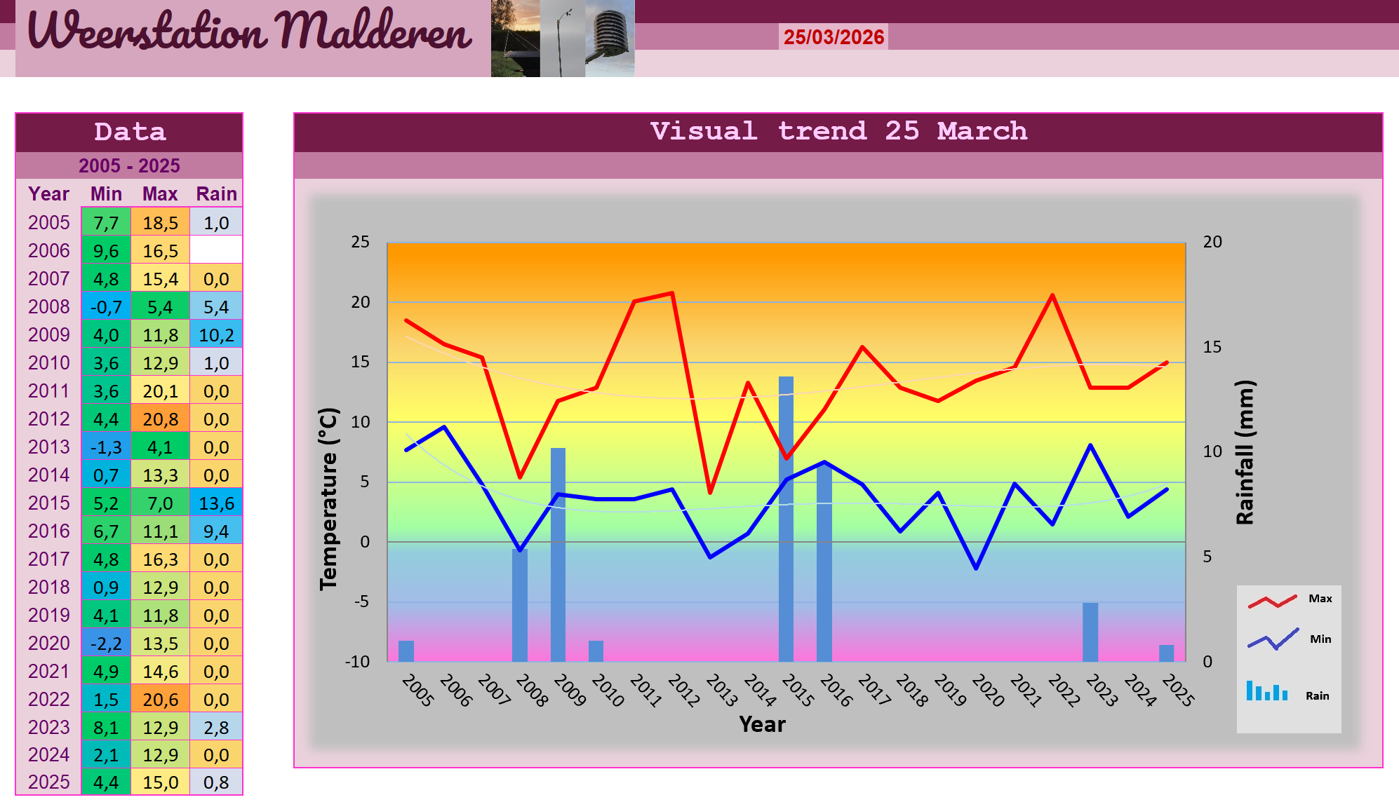 Het warme lenteweer werd na een zeer zachte nacht met minima van 11,4 graden verdergezet. In tegenstelling tot gisteren was er vandaag minder sluierbewolking waardoor de zon veel meer aan bod kwam en bovendien een stuk krachtiger was. Het einde van de lente- opstoot was echter nabij, want vanuit het zuidwesten kwam er een koufront opzetten dat spoedig voor een weersomslag zou zorgen. Tijdens de voormiddag was dit reeds merkbaar aan de bewolking die onstabiele trekjes ging vertonen, waarbij Stratocumulus castellanus verdachte nummer 1 werd. Deze bracht mooie valstrepen voort die weinig of geen neerslag veroorzaakten, maar reeds voor valse neerslagsignalen op de radar zorgden. Rond en na de middag verschenen er ook wat stapelwolkjes terwijl er nog een weinig sluierbewolking aanwezig was. In deze omstandigheden kon het nog flink opwarmen en liepen de temperaturen moeiteloos op naar 20,8 graden. Op het einde van de namiddag was er echter geen ontkomen meer aan en werd de bewolking vanuit het zuidwesten snel dikker op nadering van een eerste buienlijn. Deze deed het korte tijd flink plenzen, en werd op haar beurt gevolgd door nieuwe opklaringen. Hierin konden we nog even van de uitbundige zonnestralen genieten, maar het diepblauwe luchtruim vulde zich reeds met aambeeldvormige ijskappen van een volgende buienlijn. Deze had behoorlijk wat onweer aan boord maar zwakte snel af zodat slechts sporadisch wat onweer werd waargenomen op Belgische grondgebied. Te Malderen was er nauwelijks wat van te merken, maar de neerslag was hier ook zonder onweer erg zwaar met op sommige momenten opvallend dikke regendruppels. De rust keerde na pakweg een half uurtje weer en het neerslagtotaal stokte op 1,0 mm. De rest van de avond verliep dan weer grotendeels droog waarbij temperaturen rond 12 graden bleven schommelen. De wind ruimde naar westelijke richtingen terwijl de hoogste windstoot nog uit het zuid- zuidwesten werd gemeten met 38,6 km/h.