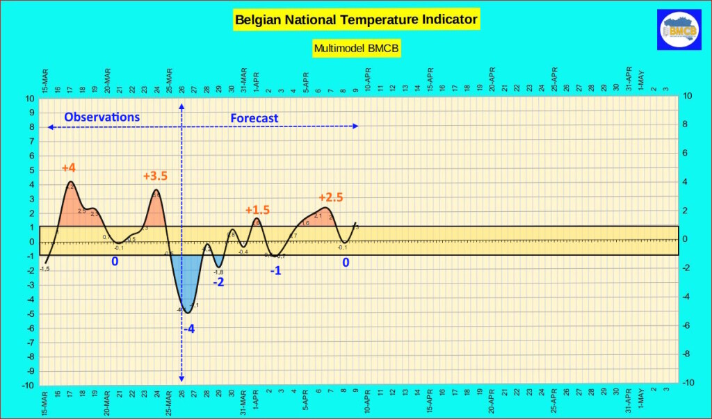 De Belgische nationale thermische indicator zal de komende 24 uur rond –4 liggen. Tijdens de laatste dagen van maart wordt echter een geleidelijke stijging verwacht, met waarden tussen –2 en +1. Dit komt overeen met maximumtemperaturen van ongeveer 6 tot 11°C op zaterdag en 8 tot 14°C tegen dinsdag.