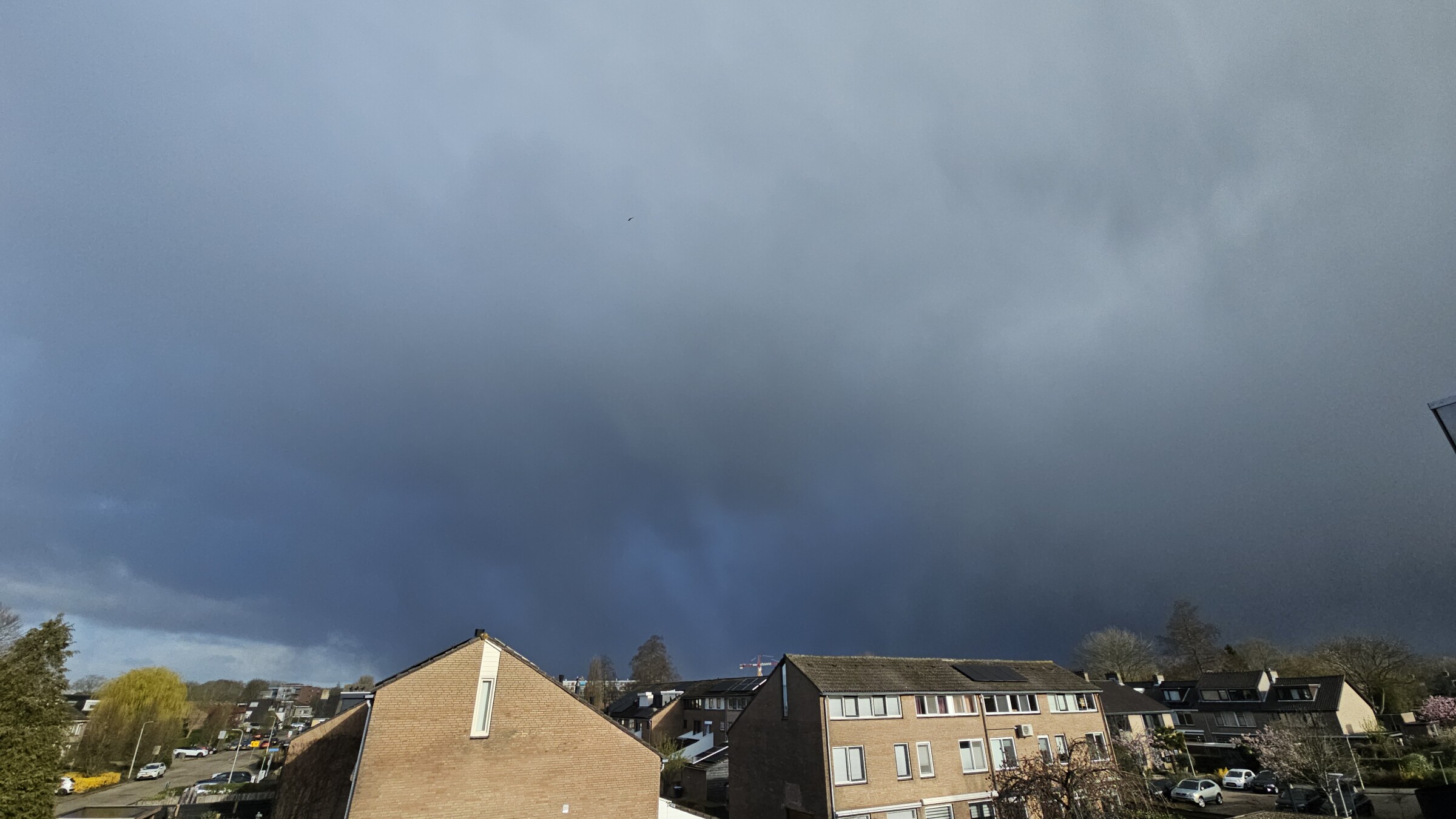 Mooi zicht op een naderende hagelbui te Leiden het afgelopen uur.