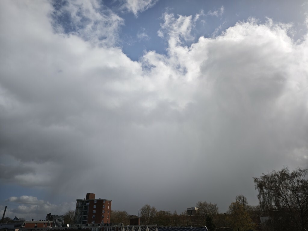 Zonet passeerde hier een bui met zweefhagel uit de lucht ( piepschuimachtige ijsbolletjes van zachte hagel), ik krijg wel de indruk dat warmte-advectie de buien wolken wat minder verticaal laten ontwikkelen