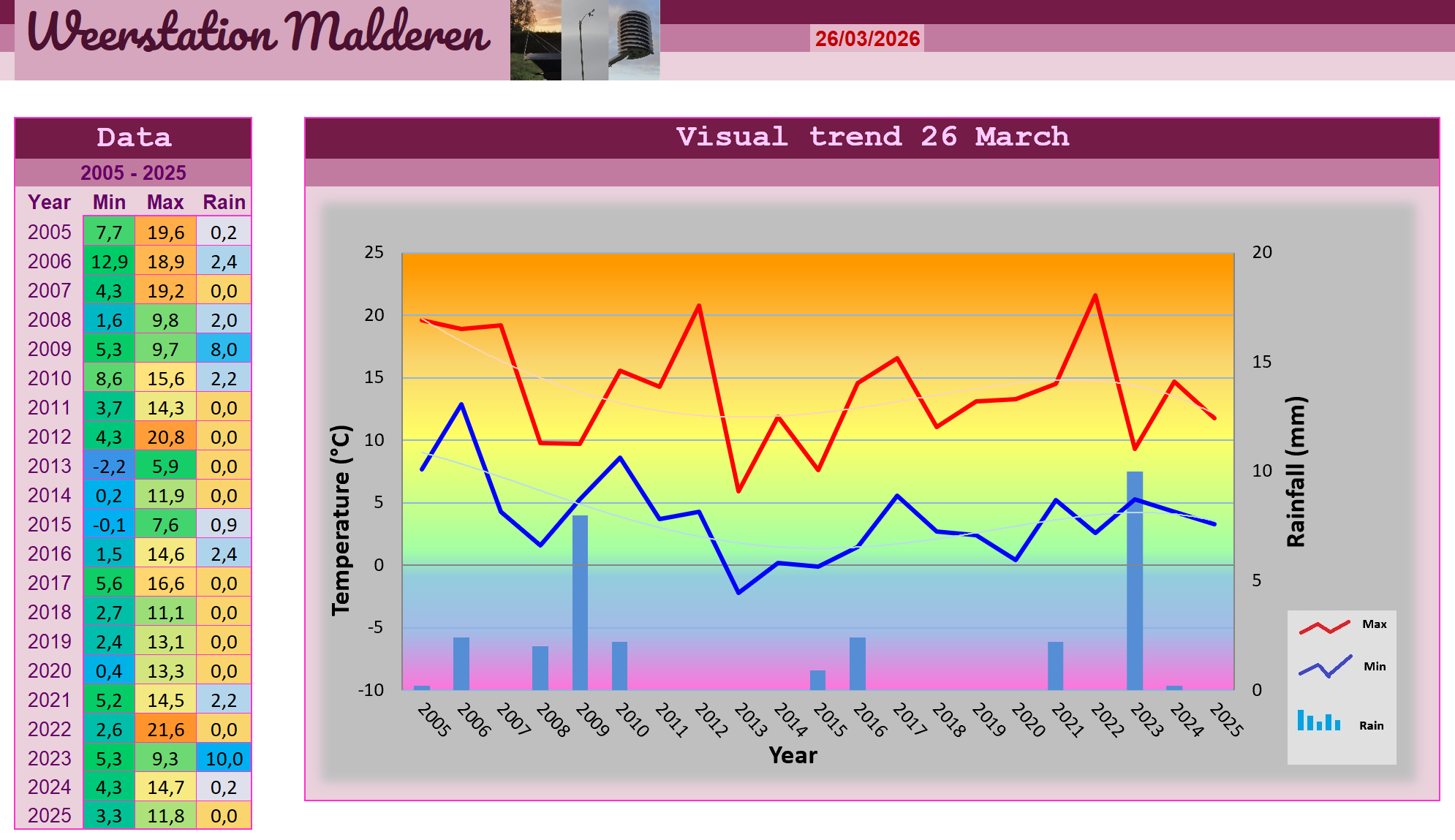 Net als de voorbije dagen was het weer koud starten met minima van 2,6 graden, maar de zon kon vervolgens weer ononderbroken aan de slag om ons terug in zomerse sferen te brengen. Vooral uit de wind voelde het erg warm aan, de wat koele noordoostelijke bries maakte het al een beetje verraderlijk in verband met zonnebrand op onze afgebleekte winterhuiden. Na de middag ontstonden er dan toch een paar wolkjes, in de lagere regionen van de atmosfeer waren dat twee kleine Cumulusjes en helemaal bovenin zagen we een paar Cirrusplukken. Hun schaduwen vielen in een zodanige hoek dat men er in Malderen van gespaard bleef en de zonneschijn dus ononderbroken werd. Dit bleef niet zonder gevolgen onder het dakje van de weerhut want daar konden we weer een erg fraaie 21,6 graden optekenen. Later in de namiddag verdwenen deze wolkjes weer maar de lucht kreeg nu een nevelige tint die vooral in het westen en noorden uitgesproken was. Het zorgde voor warme kleurentinten bij zonsondergang maar qua temperatuur was het een ander verhaal. Het koelde immers weer vrij snel af al zouden wolkenvelden die vanuit het noorden onze richting uitkomen ons van vorst moeten sparen. De wolken zelf kregen we niet meer (bij daglicht) te zien en neerslag nog minder met 0,0 mm als dagtotaal.
