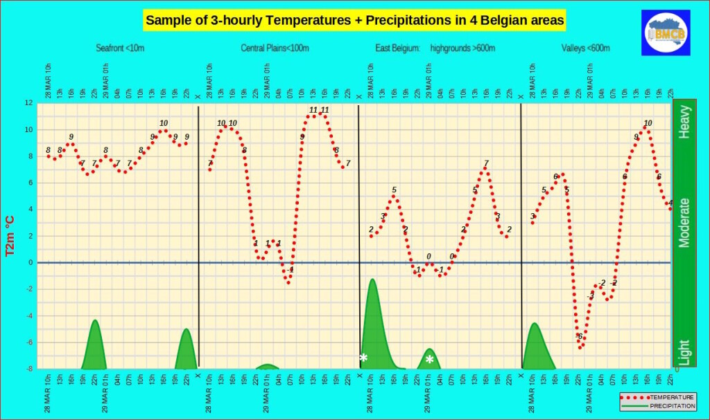 ’s Avonds wordt het overal zwaarbewolkt met de nadering van een regenzone vanaf de kust. Rond 21 uur liggen de temperaturen tussen 8 en 9°C aan zee, 7 tot 8°C in het binnenland en 3 tot 6°C ten zuiden van Samber en Maas. De zuidwestenwind neemt toe met rukwinden van 15 tot 35 km/u, lokaal 35 tot 50 km/u in Vlaanderen en het westen van Henegouwen.
