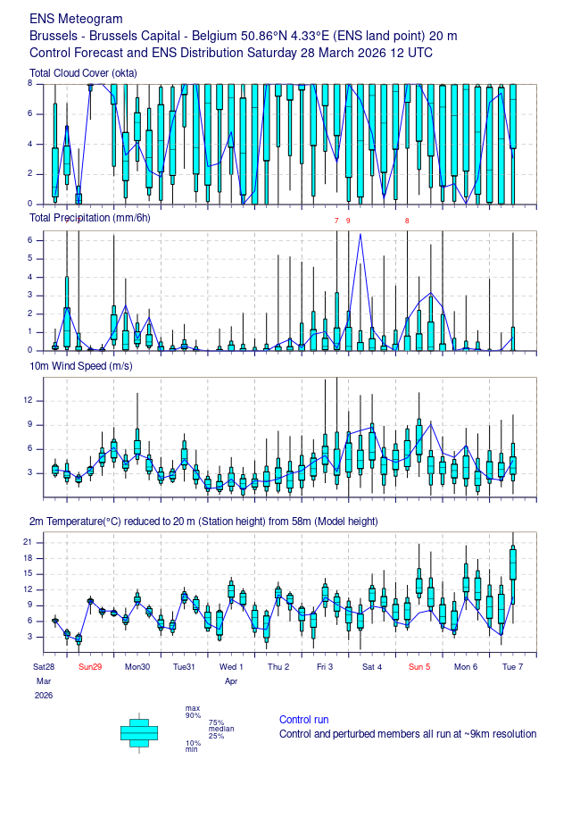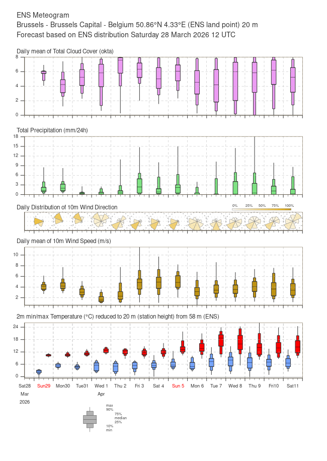 De mediaan gaat dinsdag richting 20 graden op sommige locaties. Ter illustratie het ensemble voor Brussel.