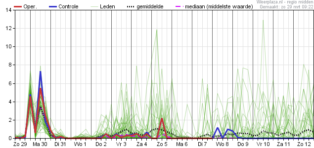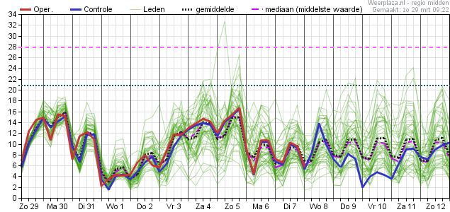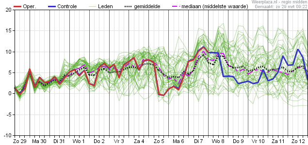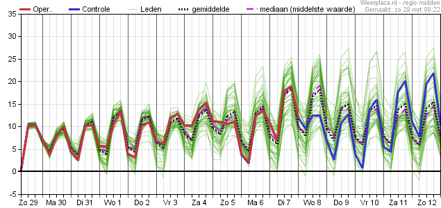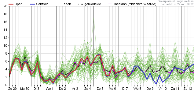 Kans op warmte (>=20°C) komt er pas vanaf volgende week zondag en heeft niet heel veel om het lijf.