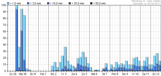 Grootste kans is op dinsdag 7 en woensdag 8 april met een percentage tussen de 40 en 50%.