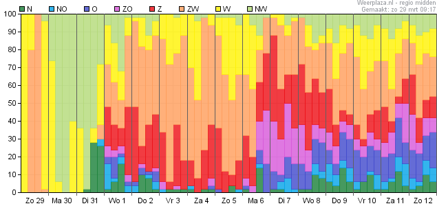 Gedurende de eventuele zeer zachte dagen van volgende week (zie hier boven bij 'temperatuur'), is de windrichting tijdelijk zuidelijk.