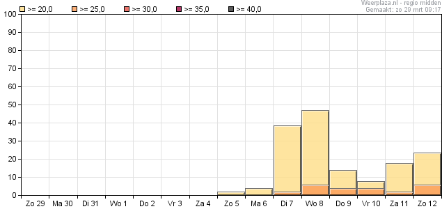 Vanaf dinsdag tot het einde van de periode is er tevens een kleine kans op zomerse waarden (>=25°C).