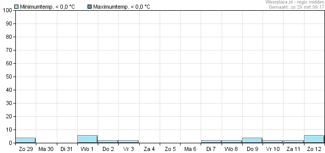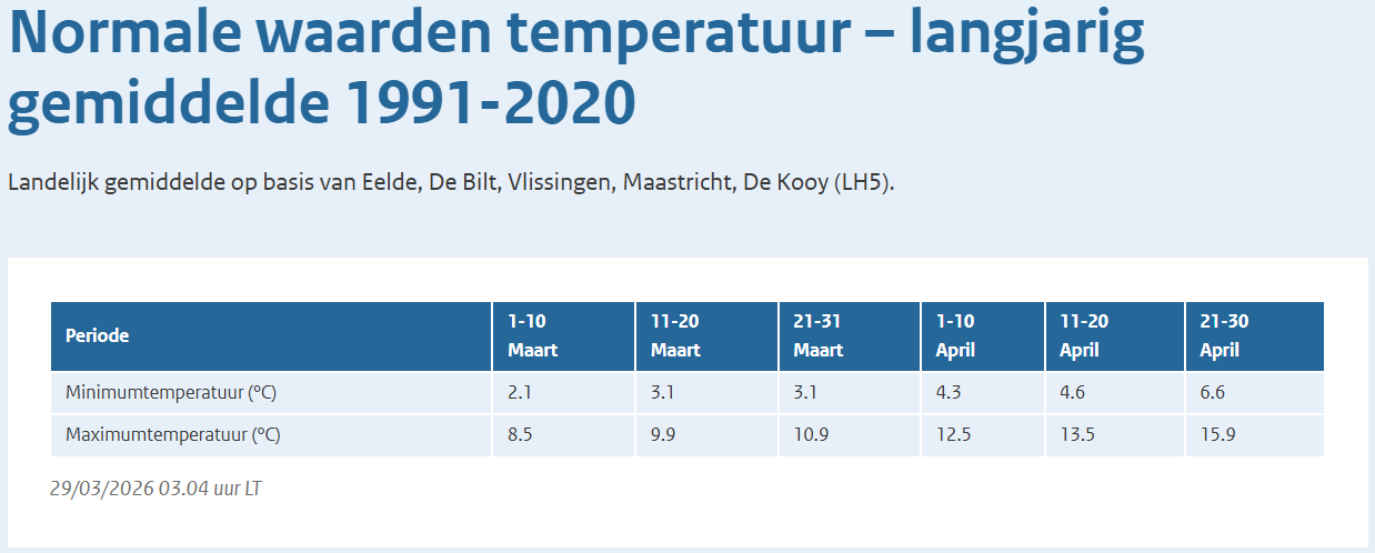 De kans op vorst is de gehele periode klein of niet aanwezig.